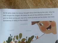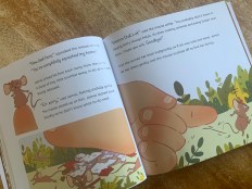 The little mouse teaching the big giant, carries some Lion and the Mouse-Aesop fable vibes, but really it is the proof-reading of the book that is disappointing. When you read it aloud, commas are abundantly missing (even in the online reading pauses are placed where commas are not written). Why is the B in Baker capitalized, and if it is the Baker’s house, as in last name is Baker, then an apostrophe is missing. Many of the lines are just awkward and halting, even if not particularly erroneous. The diction is questionable at times, Jamal “always” thinks about that day at the lake, woah, doesn’t reflect on it, but it haunts him “always.” Jamal “‘really’ didn’t have to steal,” seems to imply he was justified in stealing a little, this should be a black and white issue in a children’s book, no?