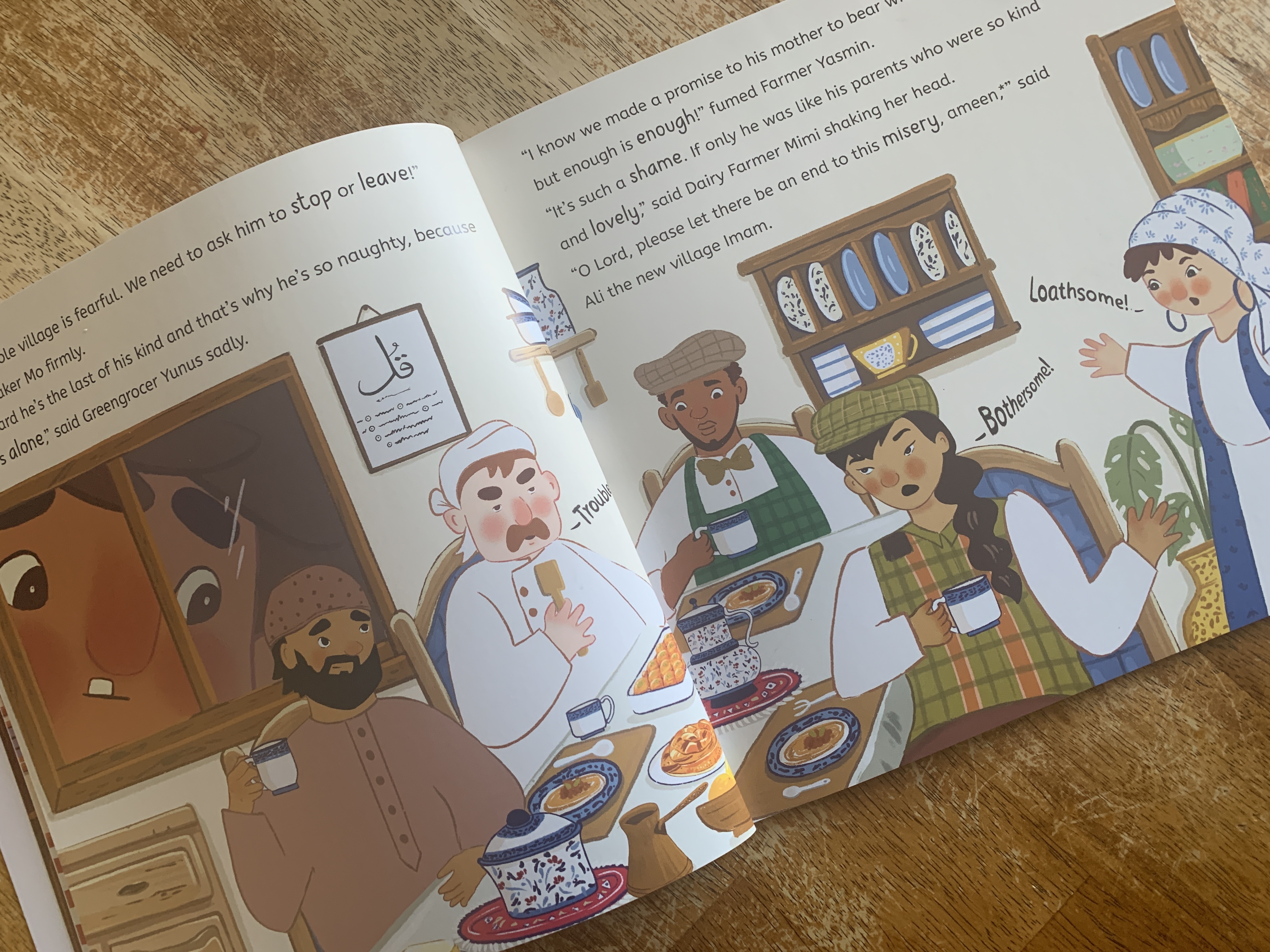 Story-wise there are some points that gave me pause. Why is there an owl flying off in the daytime, sure there are some diurnal owls, but most kids are taught owls are nocturnal, why not change it to a woodland bird that is active in the day, don’t confuse kids. It doesn’t specify a timeframe that the story takes place in, but it feels like a fable with talking animals a giant and a clear message. There is a baker, a farmer, an imam, a greengrocery, it is all very quaint, but then the imam is holding a cell-phone, wait what? I do appreciate that the farmer is female though, and that some of the women cover and some do not, it seems representative.
