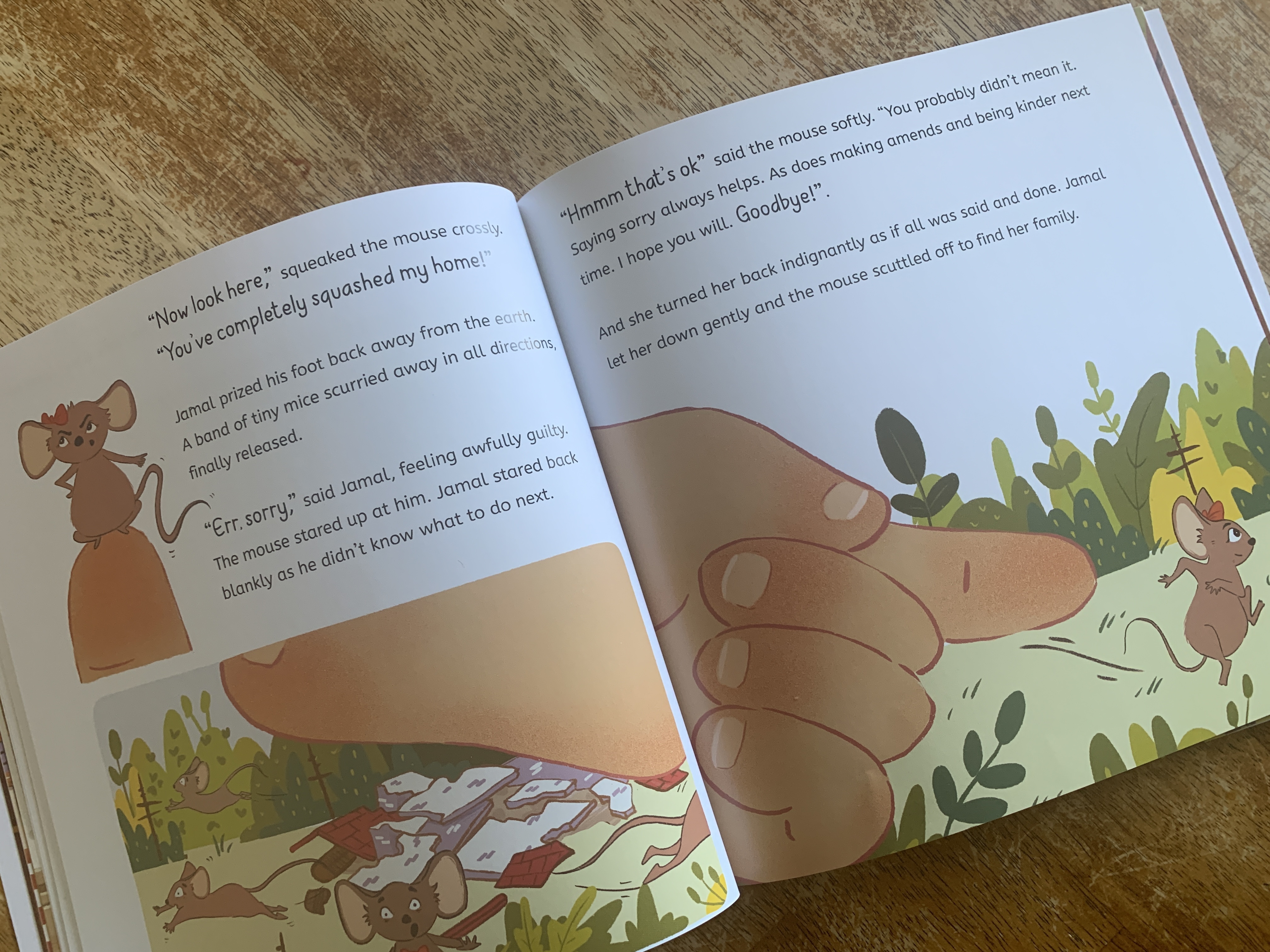 Jamal the Giant isn’t necessarily mean, but he is careless, young, and selfish. He scares the animals in the woods, destroys their homes, ruins farmers’ crops, and steals from the village. One night, he wants to steal some juice and in the process overhears the community members discussing how different he is from his kind parents, and that he must be forced to leave. He tries to mend his ways before he is driven from his home, but to no avail. Unsure how to fix things, it is the advice of a tiny mouse that sets his reform in motion and conveys the message from the Quran, surah 11 ayat 114, “Good deeds cancel out bad deeds. This is a reminder for the mindful.” He learns he must apologize, make amends and be kind.