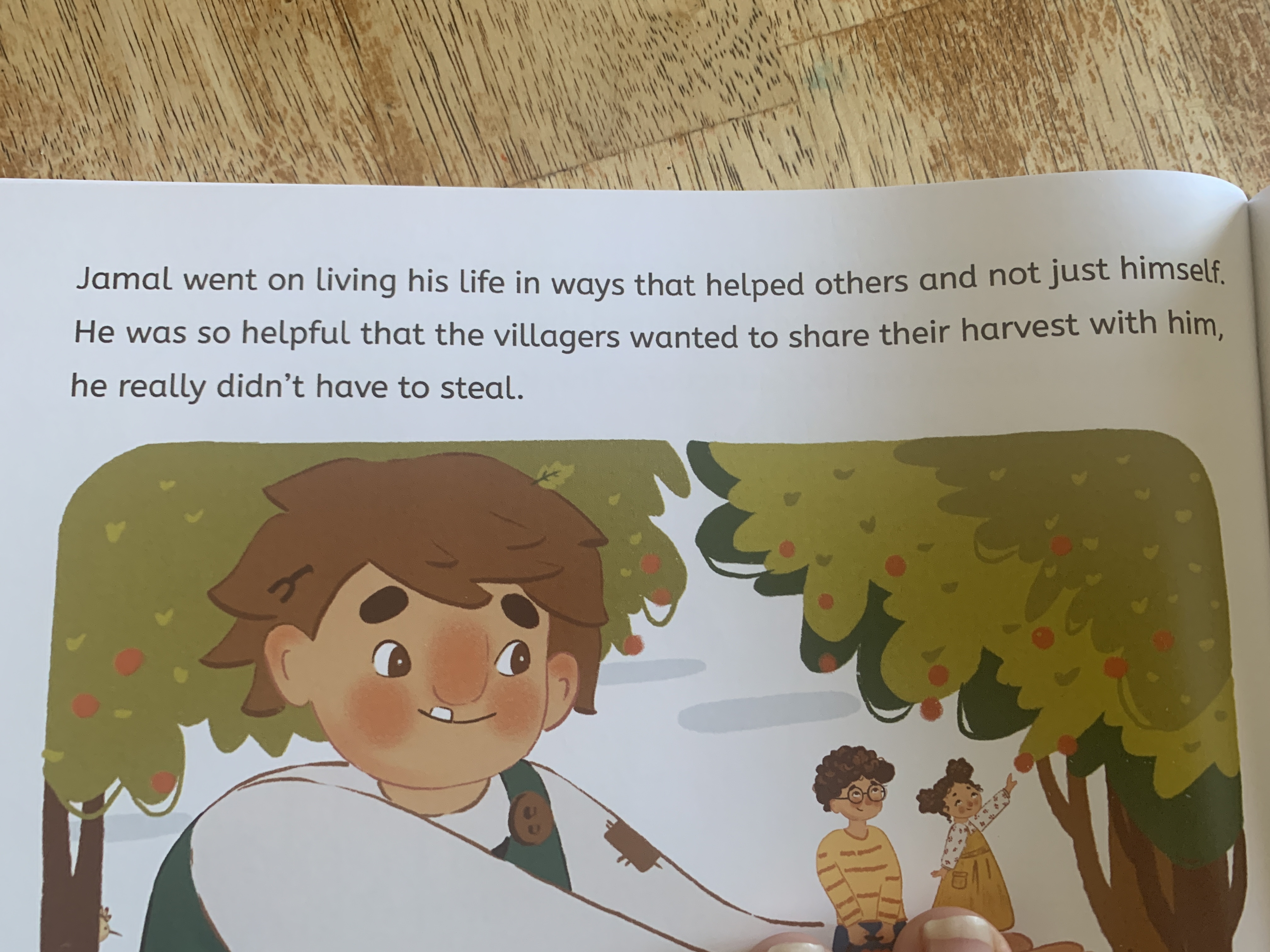The little mouse teaching the big giant, carries some Lion and the Mouse-Aesop fable vibes, but really it is the proof-reading of the book that is disappointing. When you read it aloud, commas are abundantly missing (even in the online reading pauses are placed where commas are not written). Why is the B in Baker capitalized, and if it is the Baker’s house, as in last name is Baker, then an apostrophe is missing. Many of the lines are just awkward and halting, even if not particularly erroneous. The diction is questionable at times, Jamal “always” thinks about that day at the lake, woah, doesn’t reflect on it, but it haunts him “always.” Jamal “‘really’ didn’t have to steal,” seems to imply he was justified in stealing a little, this should be a black and white issue in a children’s book, no?