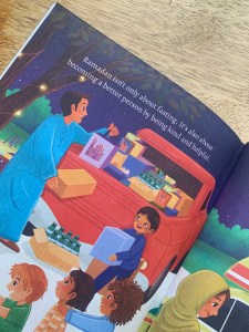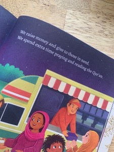 The story is told in the first person and opens with a family searching the sky for the moon. It then says in a single paragraph on a two page spread that “during Ramadan, Muslims eat and drink only when it is dark.” It then asks why? Answering on the next spread with, “the Qur’an.” It says that it is read in many different languages, which technically isn’t wrong, but I wish it would have said that it is written in Arabic. It continues to say that “the Qur’an tells us how to be Muslim.” To care for people, to pray. to fast, but that children and those that are sick aren’t required.