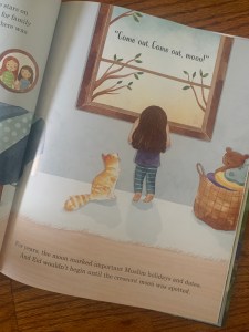 The Author’s note tells of the family’s tradition to hide and find moon rooks with coins in them, in what sounds akin to an Easter egg hunt. It also erroneously says that Eid al Fitr is a three day holiday. I don’t get the connection to the moon being brave and a source of light to refugees in the book, if that was the author’s intent, to show the moon as hope “when times are bleak and dark,” I’m sorry but the message was not conveyed.