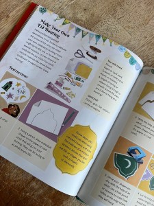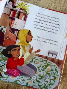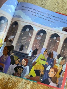 The book starts with Hafsa peering through her telescope looking for the Eid moon. Once spotted, cousins are called, Quran is finished, duas are made, and the feast preparations begin. It is a lot of work, and when they are done, Abu starts packing everything up.