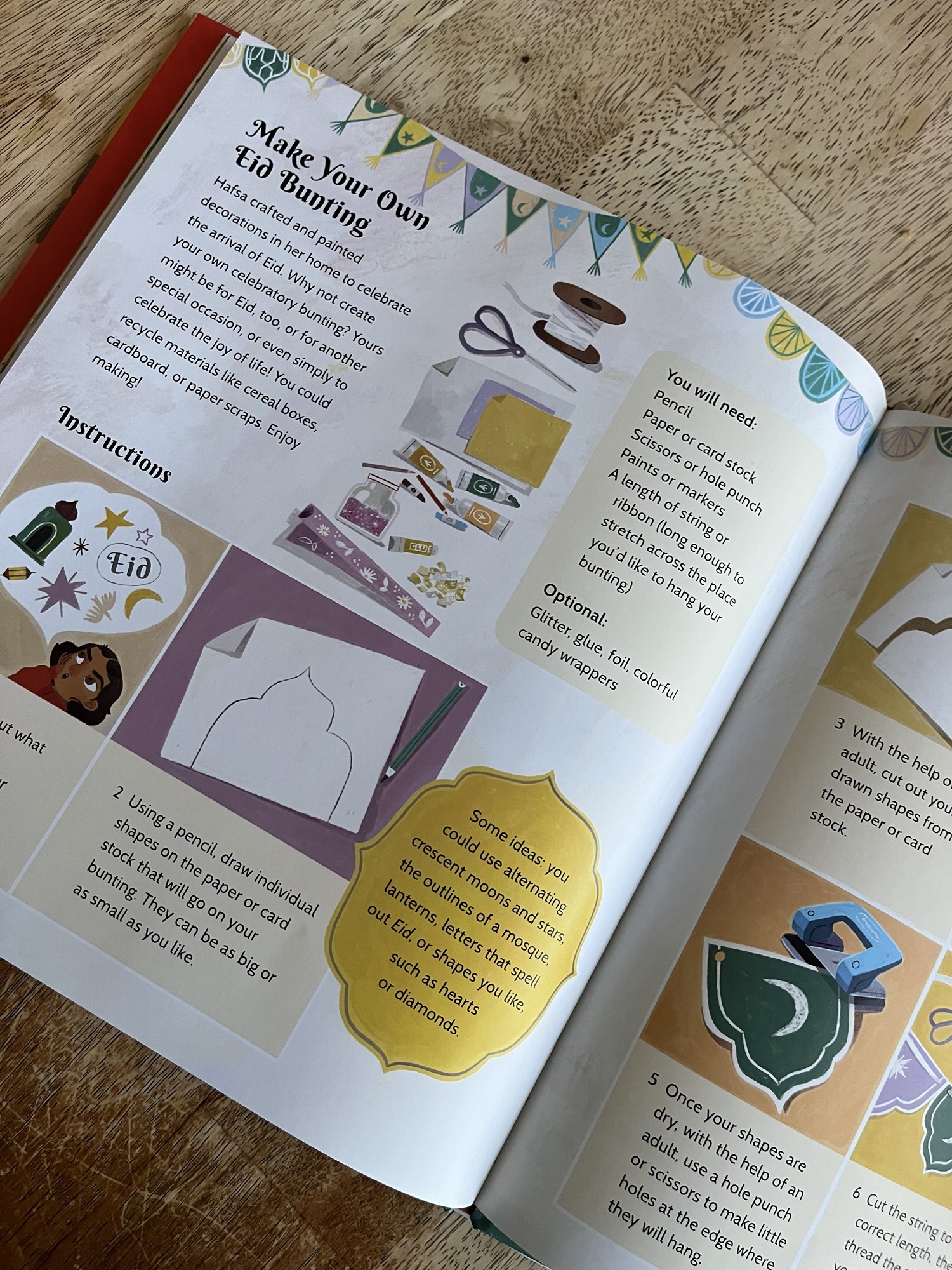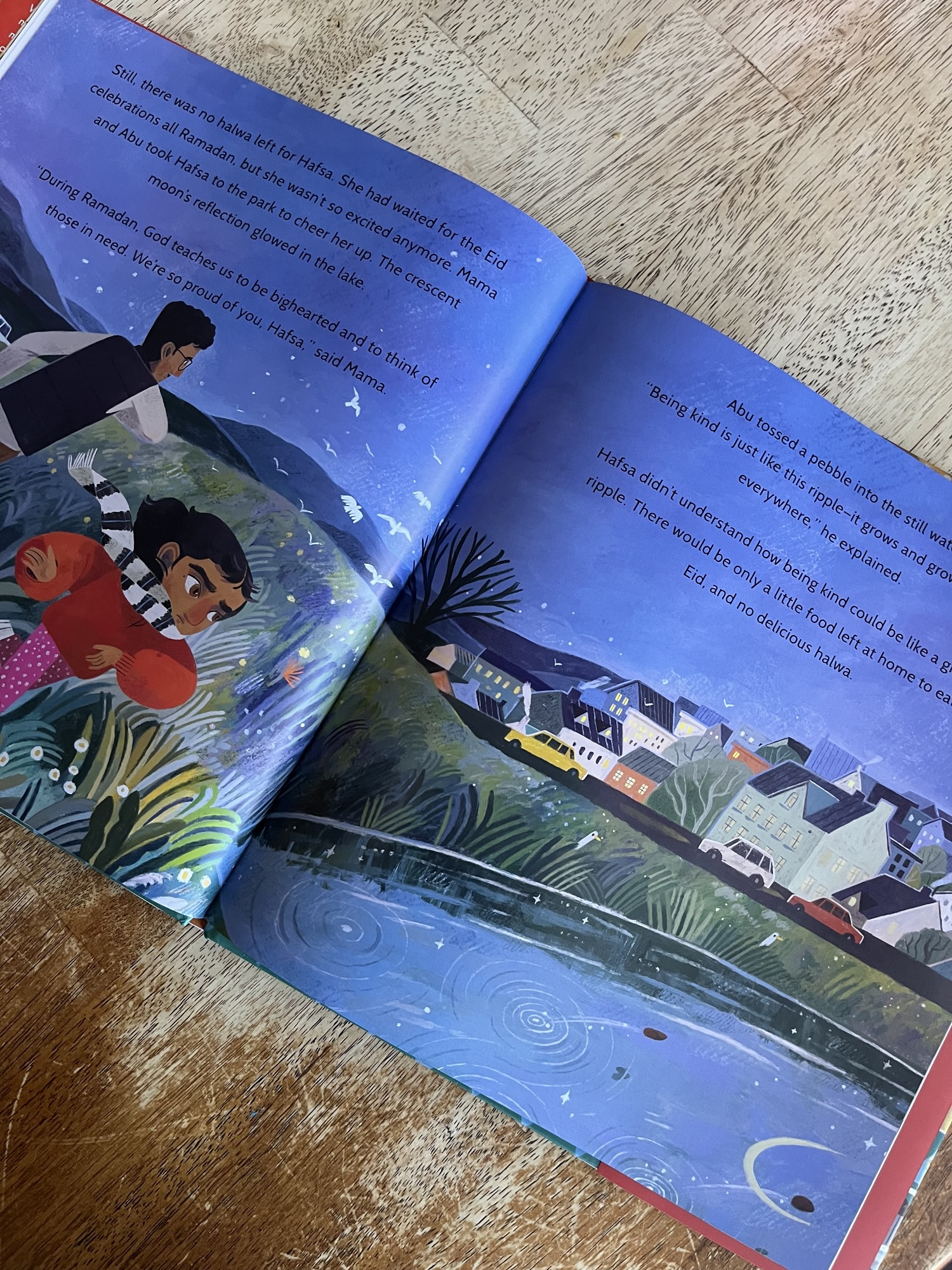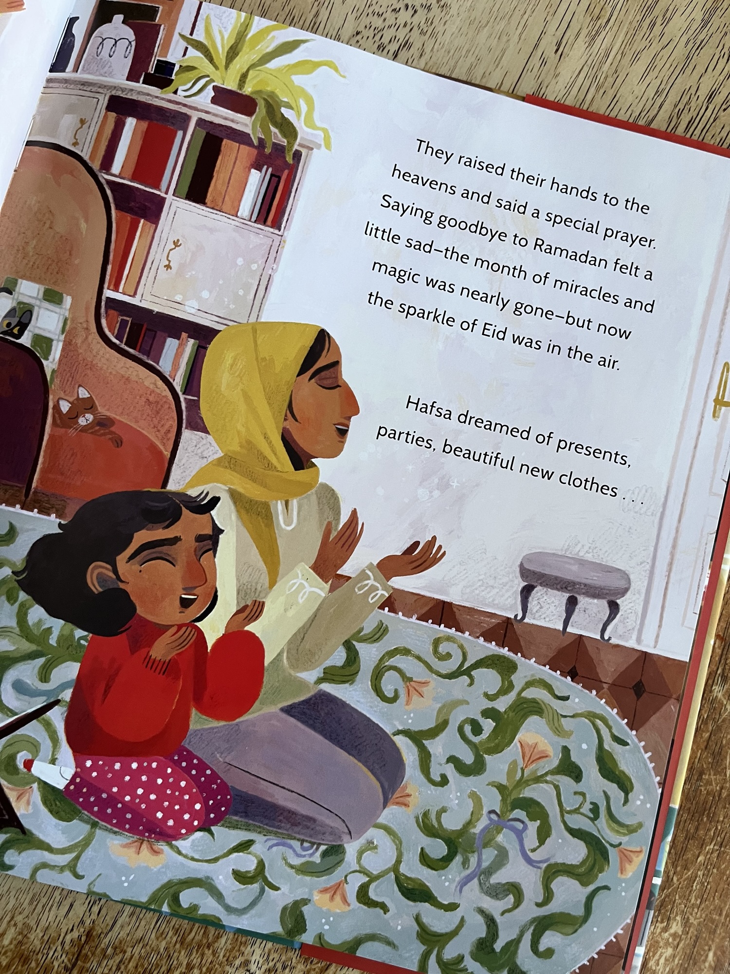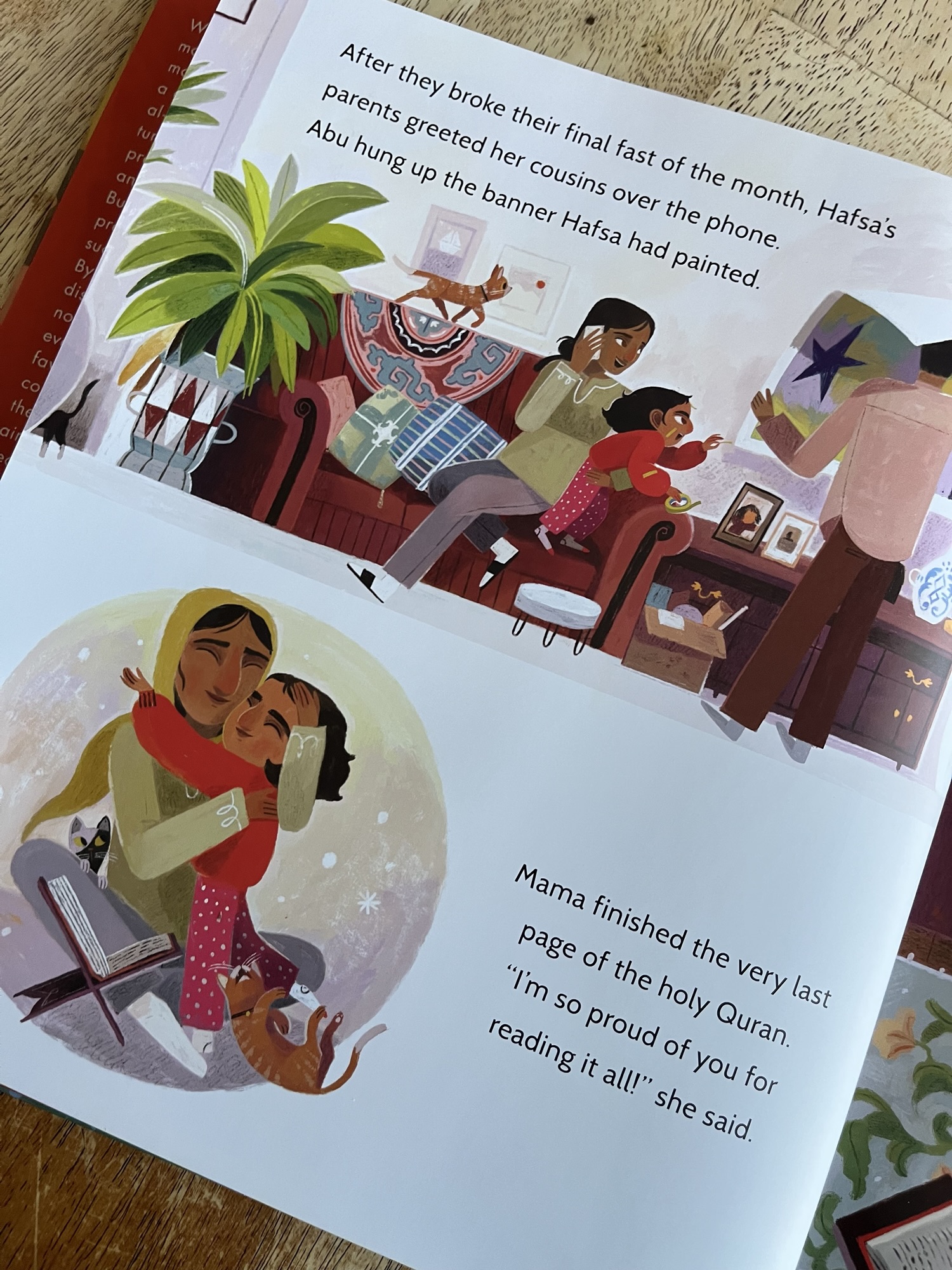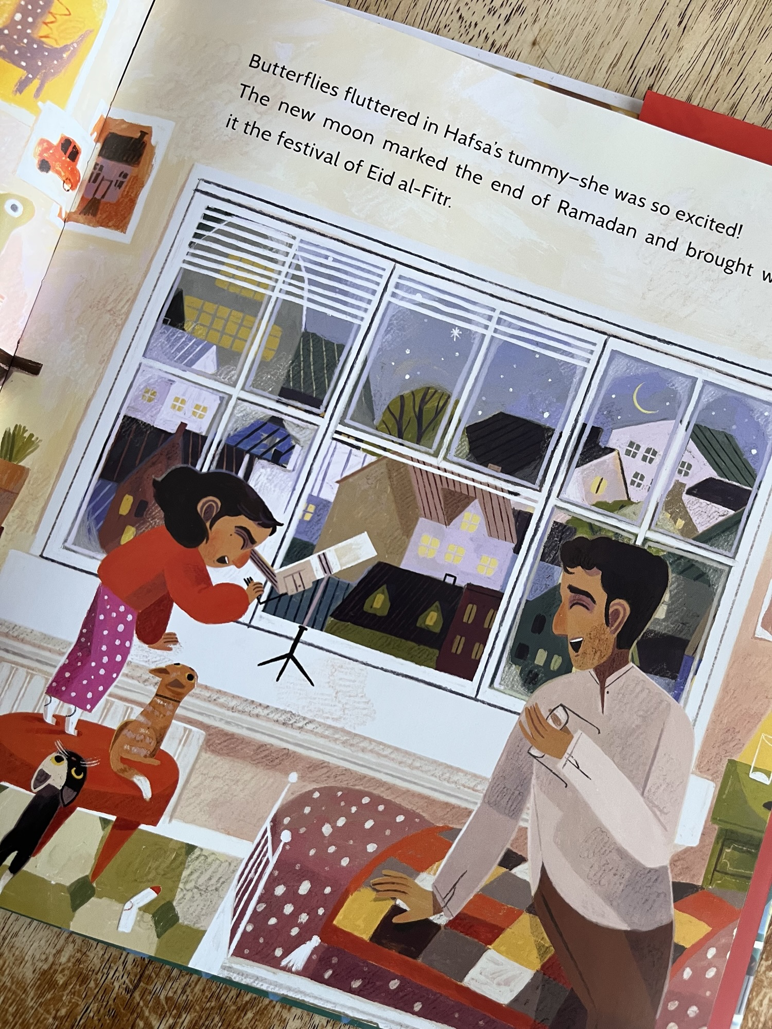 The book starts with Hafsa peering through her telescope looking for the Eid moon. Once spotted, cousins are called, Quran is finished, duas are made, and the feast preparations begin. It is a lot of work, and when they are done, Abu starts packing everything up.