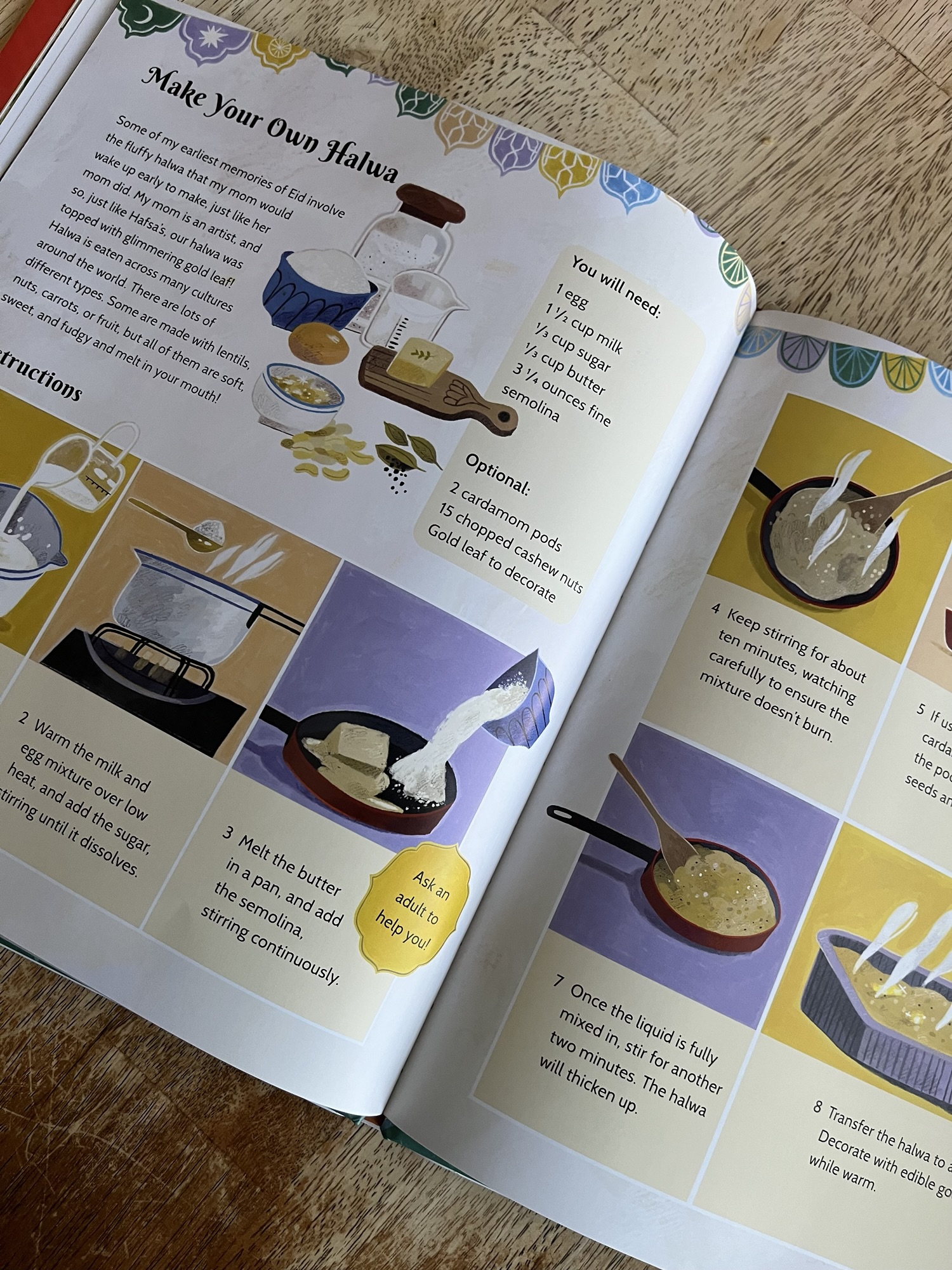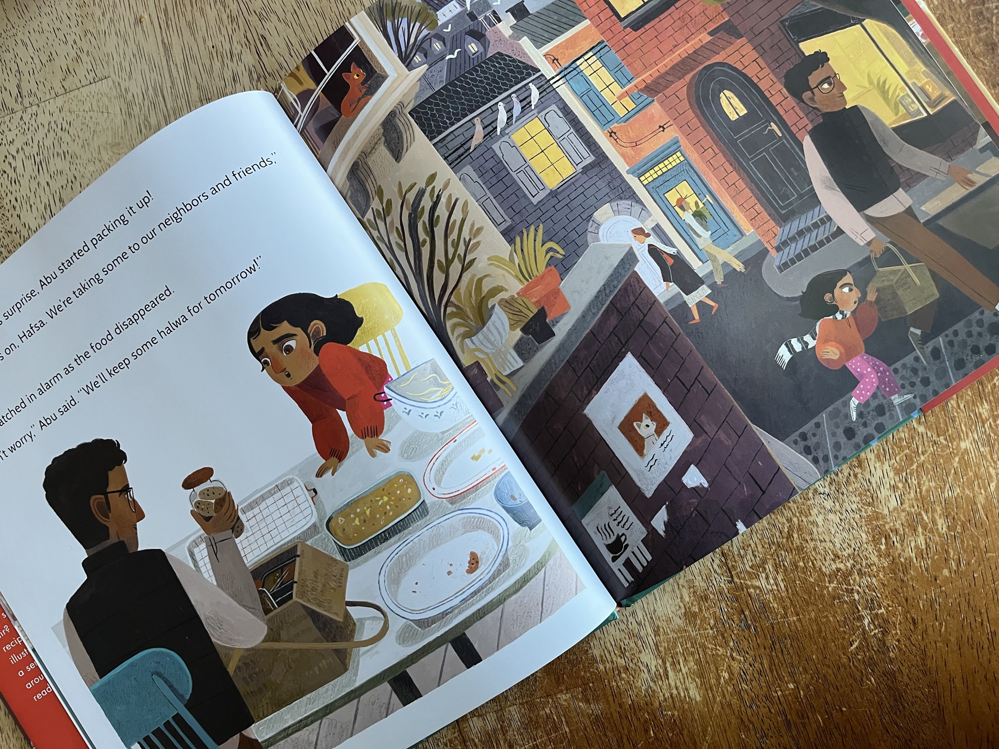 Shocked, Hafsa is reassured that some halwa will be kept to be enjoyed on Eid, and then Abu and her are off to share with friends and neighbors. When they get to Mrs. Adams’ house, Hafsa notices the cupcakes have run out, and runs home to get the halwa to give to their neighbor.