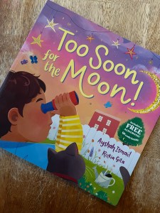 The large 10 x 10 size makes the book suitable for bedtime or story time, and while it might have been better as a board book with a premise of a child not knowing what the moon looks like and where to find it. I found it more troubling that the rest of the family and masjid community didn’t take looking for the moon more serious.