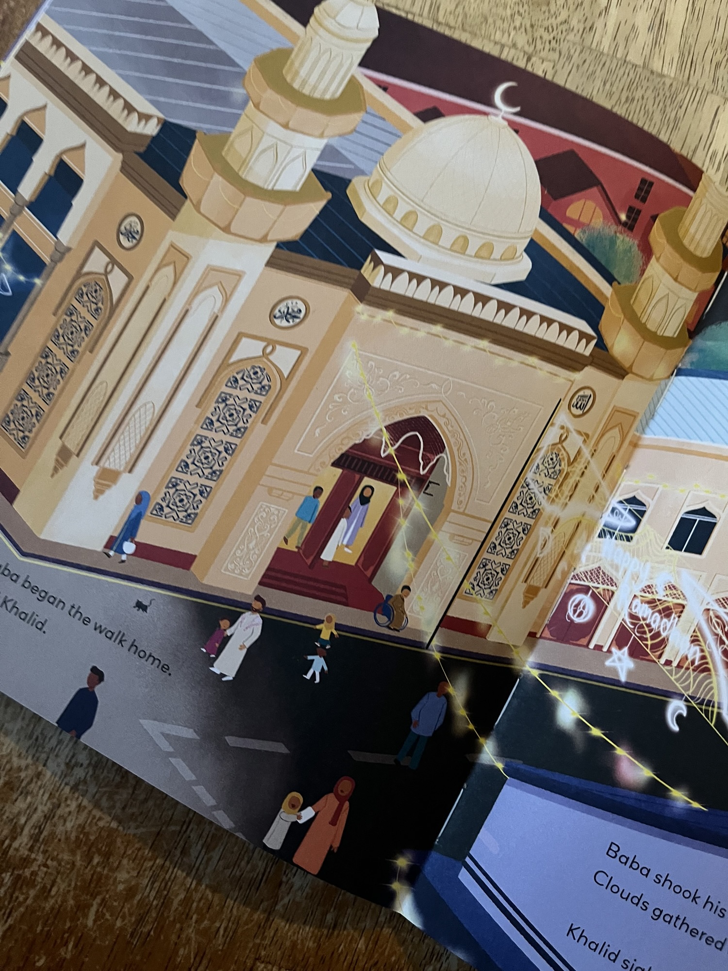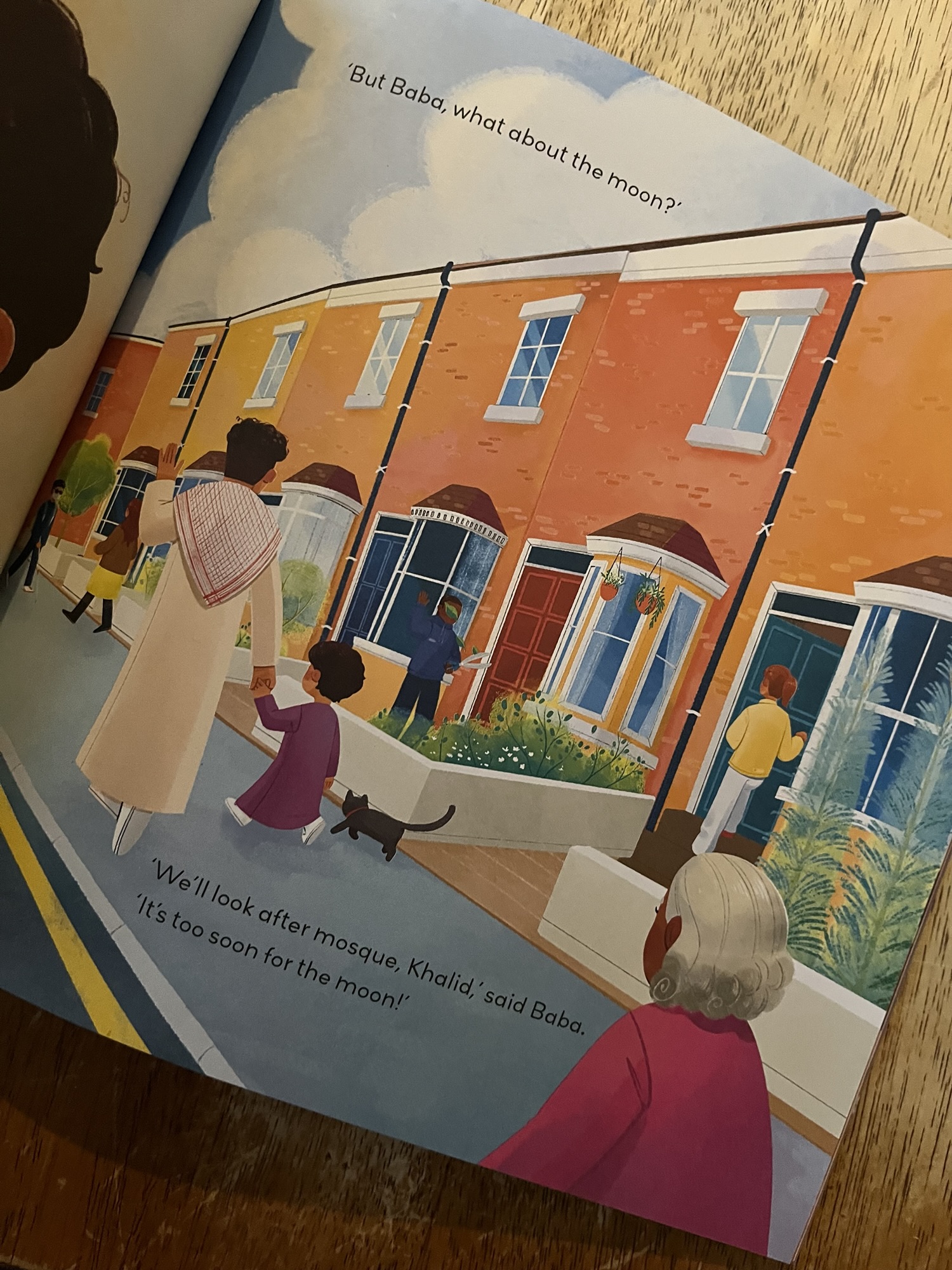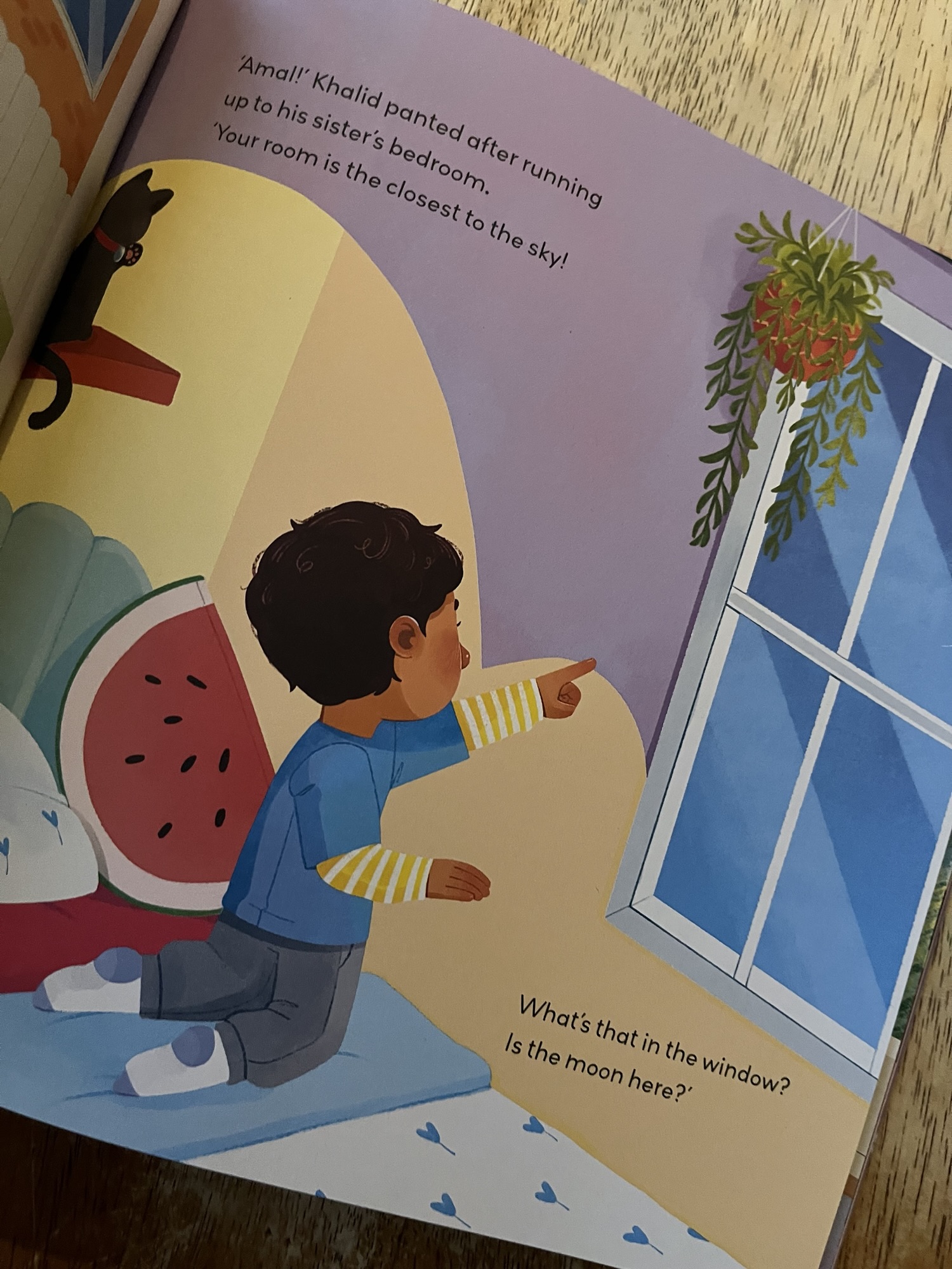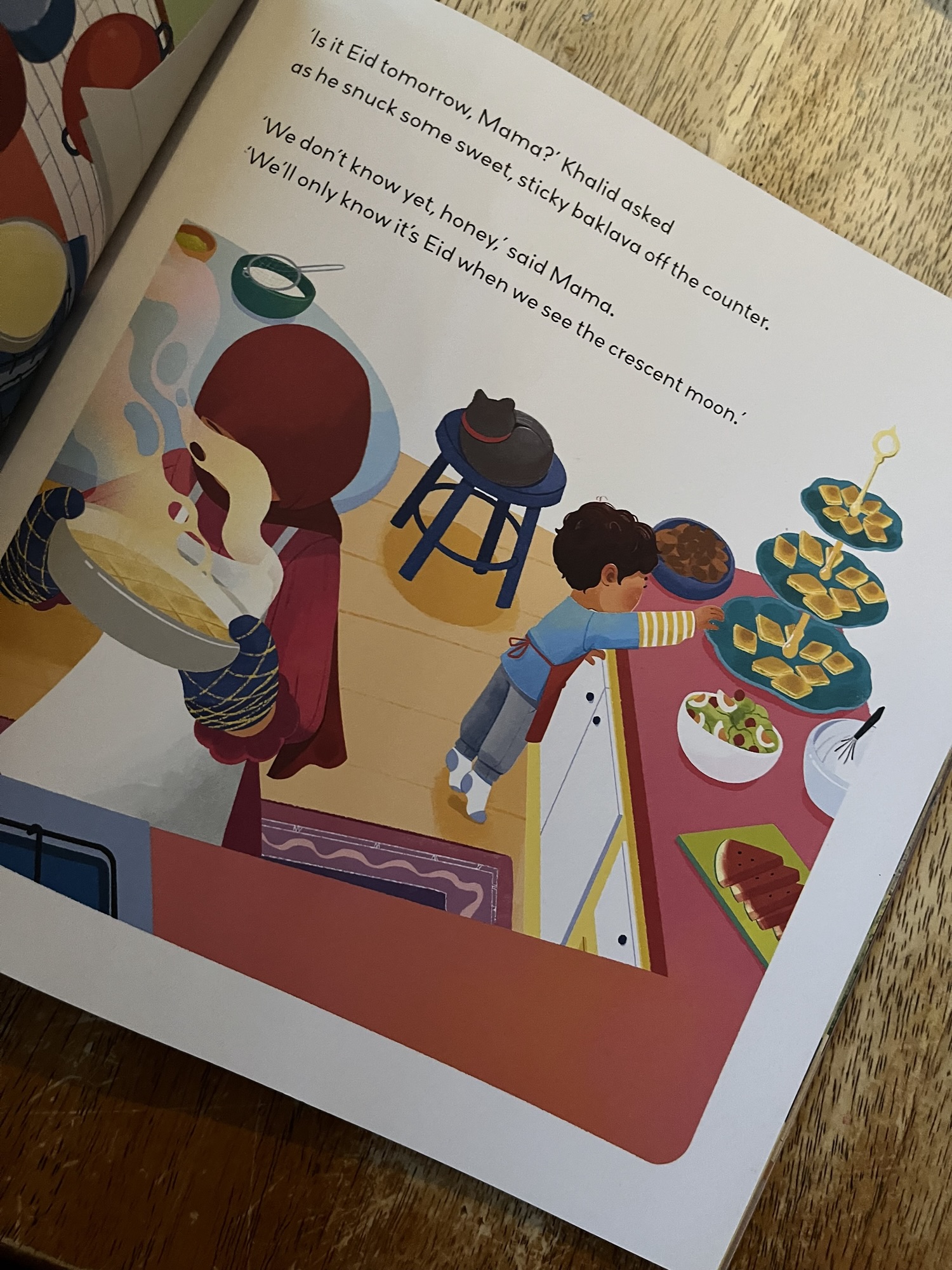 The book starts with Khalid helping Mama bake baklava in the kitchen asking about the Eid moon. Concluding that the sooner it is found, the sooner they can enjoy the treats and gifts, he is determined to find it. The holiday lights outside obscure his view with Baba, so he heads up to his sister’s room for a better vantage point, but the cat’s collar reflecting is all he sees out the window, the glint of his aunt’s bowl back down in the kitchen also doesn’t help him find the moon, and they all keep telling him that it is “too soon.”
