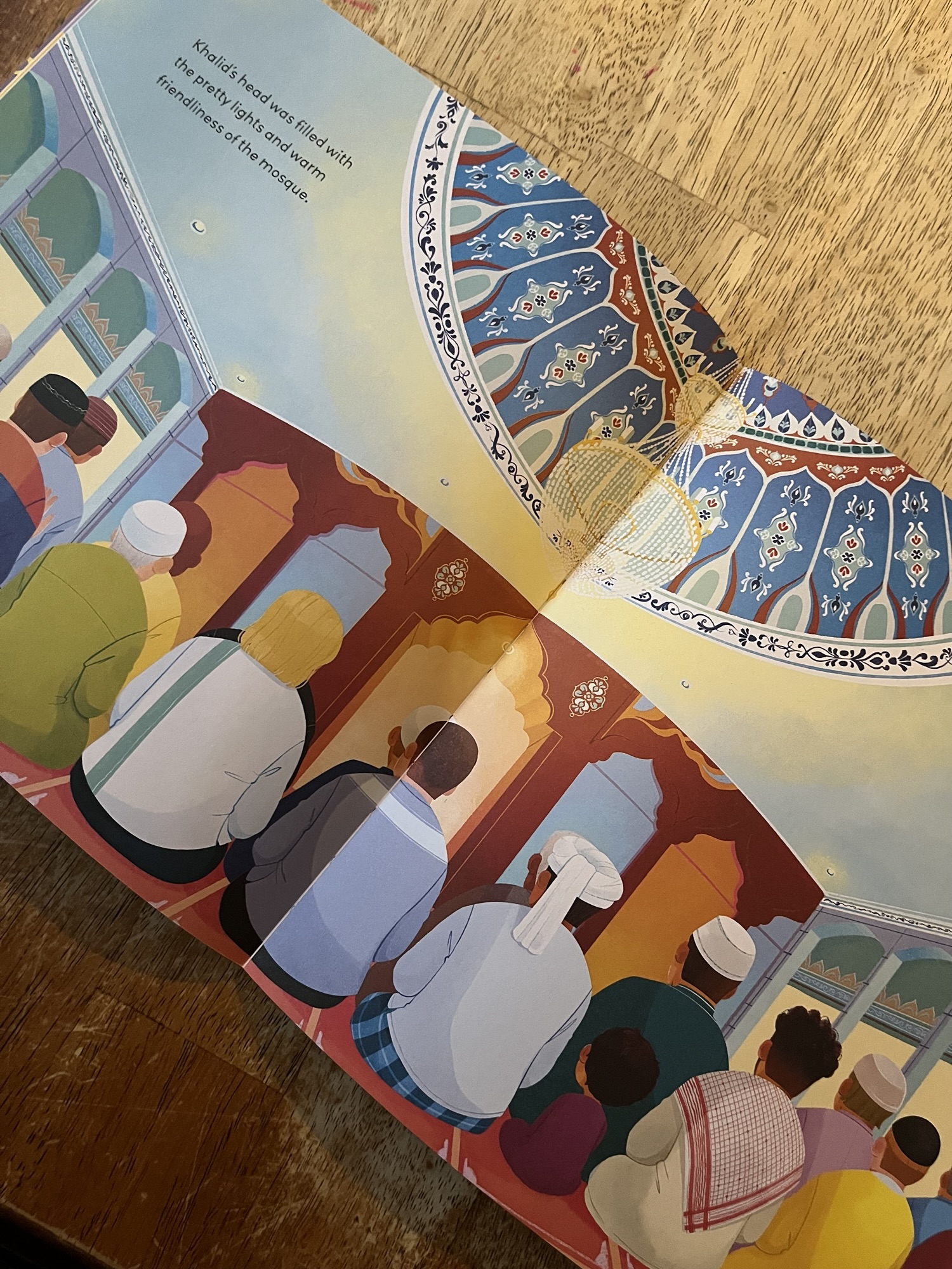 The large 10 x 10 size makes the book suitable for bedtime or story time, and while it might have been better as a board book with a premise of a child not knowing what the moon looks like and where to find it. I found it more troubling that the rest of the family and masjid community didn’t take looking for the moon more serious.