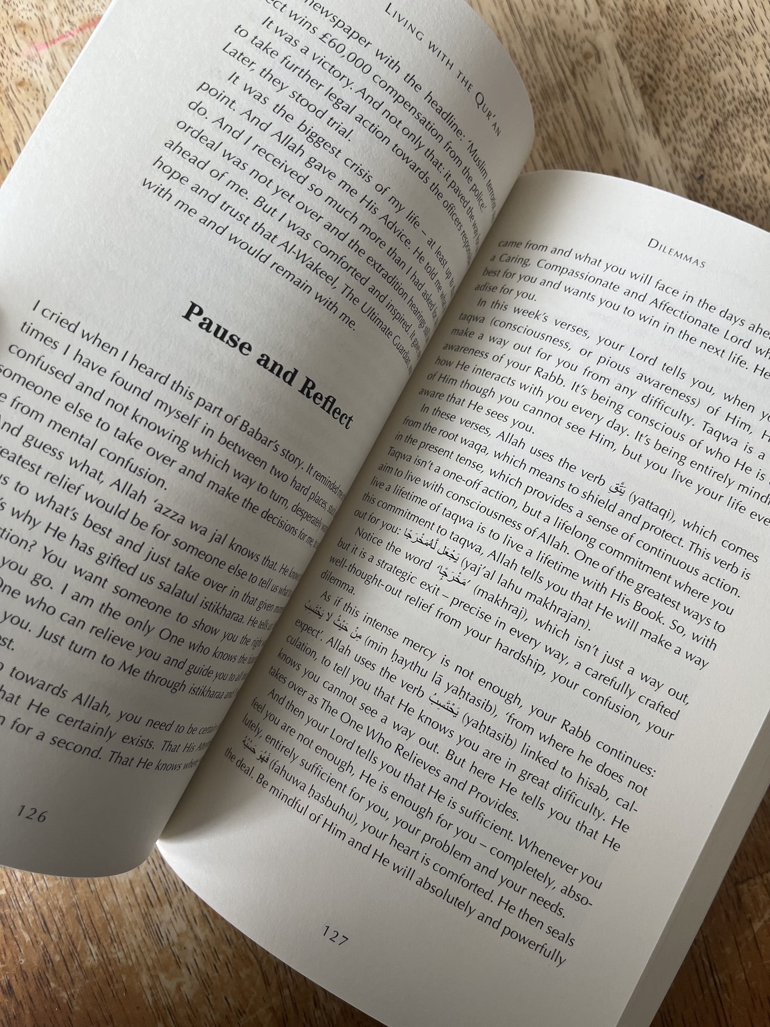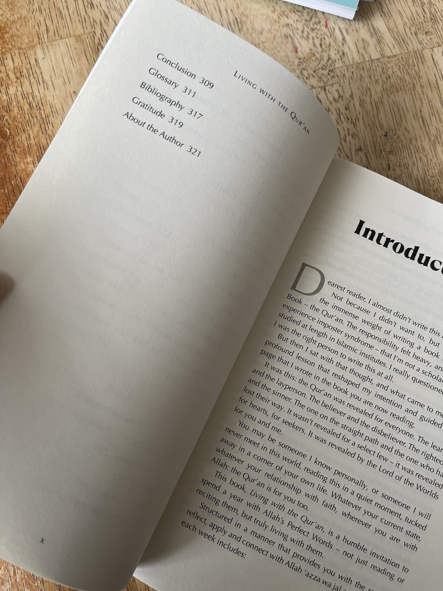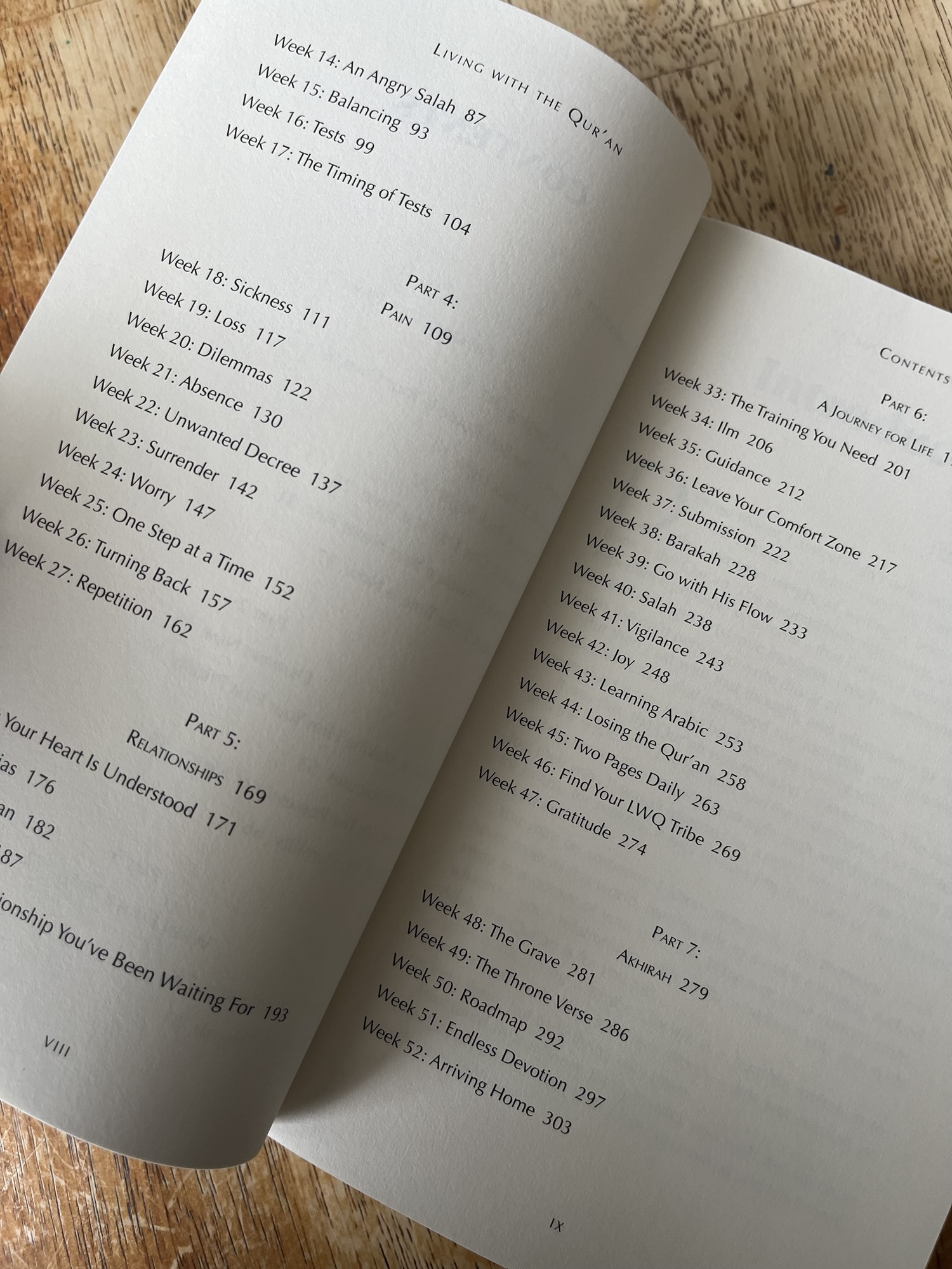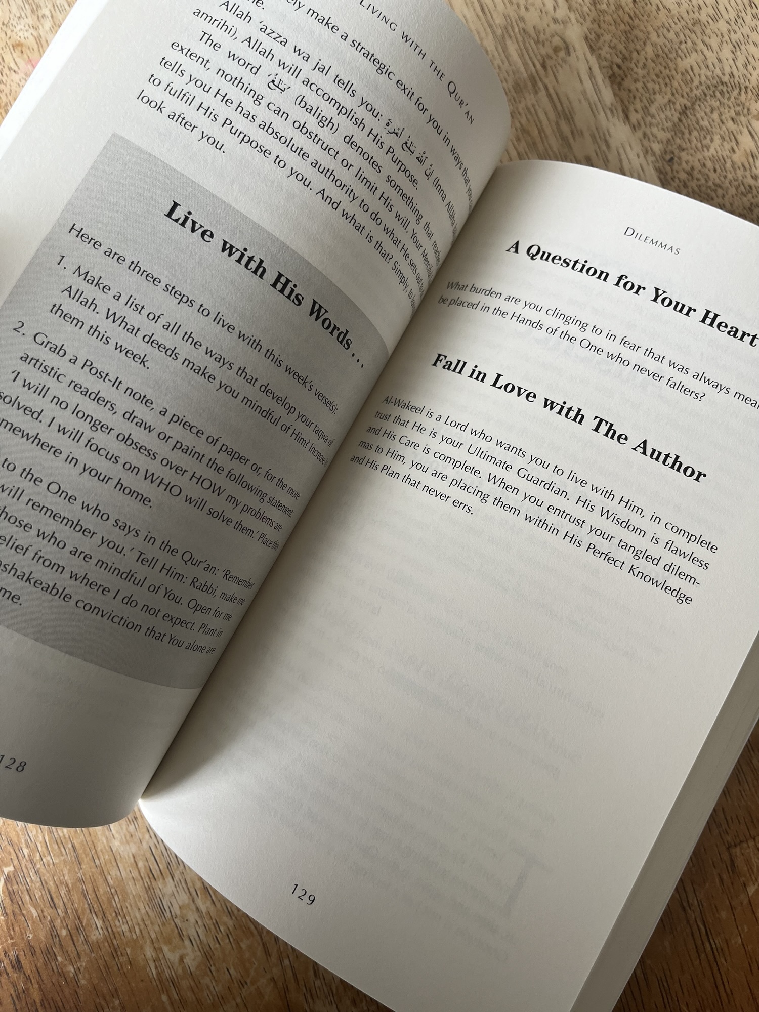 Each chapter is meant to be put into action a week at a time for the entire year. The chapters have a theme, a verse from the Qur’an in Arabic, the transliteration in English and the meaning in English, a few paragraph description or detail tying it all together by the author, a story from some outside individual, a “Pause and Reflect” section highlighting what the author wants you to gleam from the story and how it relates to the topic of the chapter. There is then a “Live with His Words,” section that are action based tasks to engage the reader/listener with the Qur’an in practical ways. Next is “A Question for your Heart,” where you are pushed to consider or reflect about your own relationship with the Qur’an, and finally a section called, “Fall in Love with The Author,” where Allah’s (swt) name or names are connected to the content of the chapter.