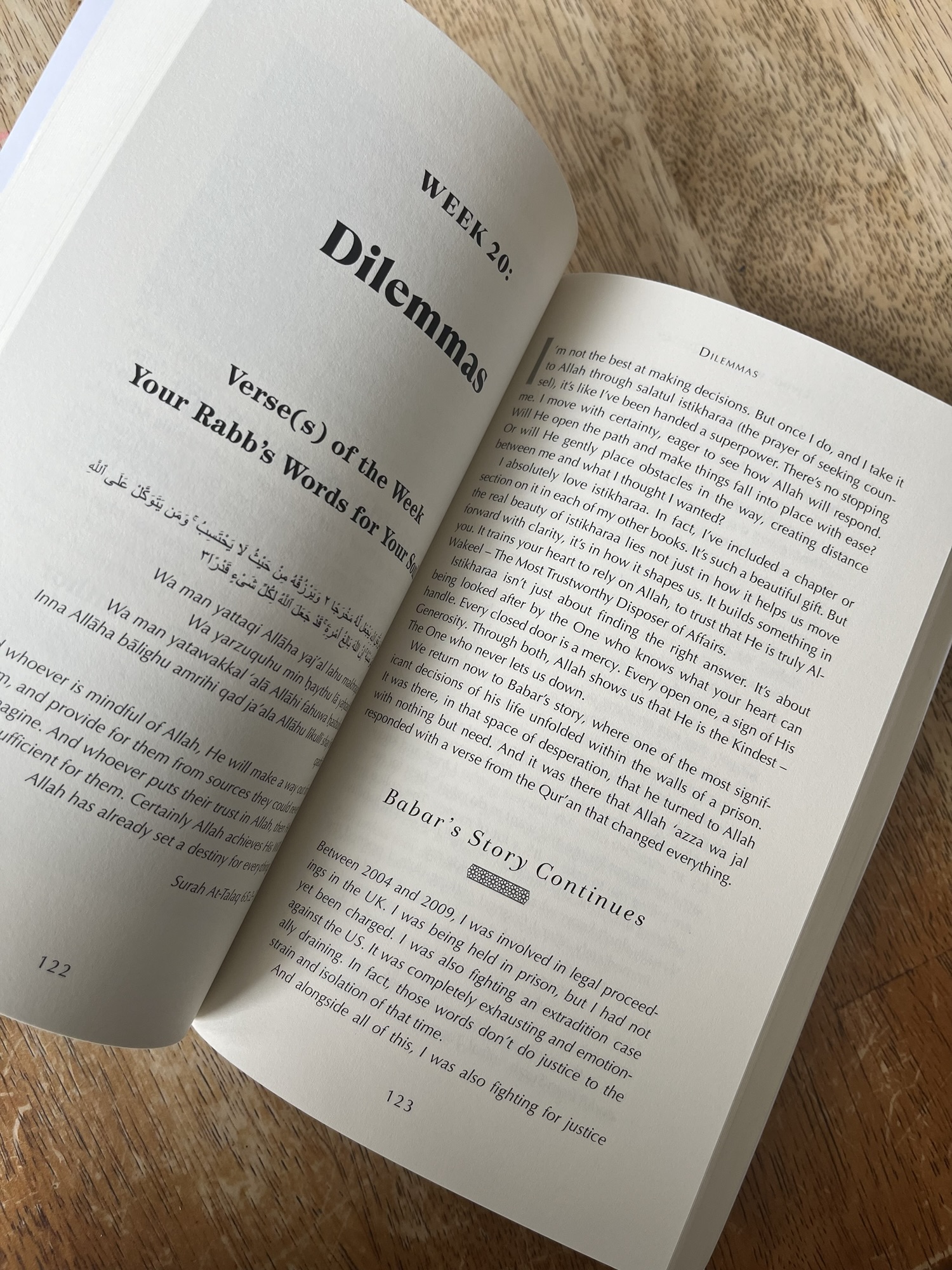 I had heard that this book contained numerous transliteration and translation errors, that the humble brags and social media references affected the tone of the book, and the insight stayed pretty surface level. I wasn’t too worried about the lack of depth, as I’m not particularly knowledgeable, but since I had preordered this book with the hopes of spending time with it in Ramadan, and I was really looking forward to it having enjoyed her previous books, particularly her Power of Du’a one, I was determined to find a way to benefit from it. The logical choice for me, was to then not read the book, but listen to the audio book, as to not get hung up on any errors. And alhumdulillah it was a great decision. The author reads the book herself, so when the personal reflections are shared, it simply feels like a conversation and her referencing her own life as it relates to the topic at hand, the stories of other people are received as if she were talking about a friend who went through something similar, and the recitation of the Quran by Sumayah Hassan, was beautiful and thus no transliteration was needed. I also did not spend a week on each of the 52 chapters, I simply had it on when I got in the car and turned it off when I got out. The actionable items will need revisiting at some point, but I was moved by a sufficient amount that have already been put into action, and a few passages that struck a chord, I did reread in the physical copy and highlight. Just because I didn’t use the book as intended, I overall did enjoy the book, benefit from it, and connect with the organization and messaging, alhumdulillah.
