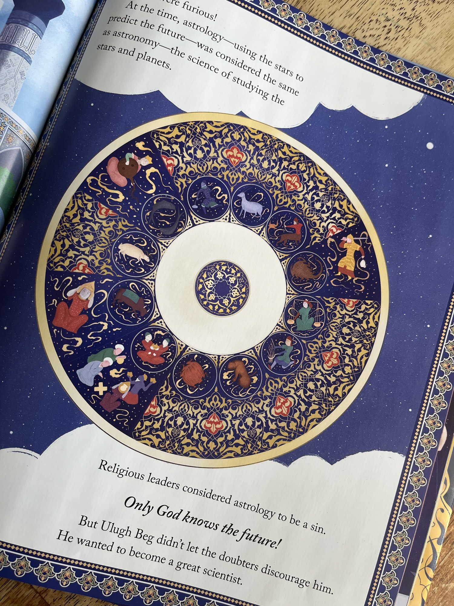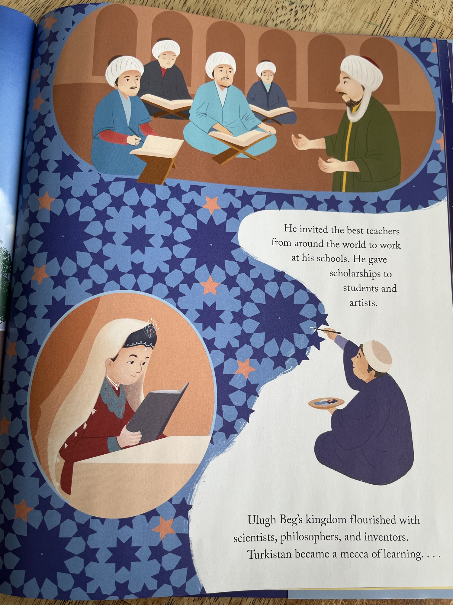 The king of the Timurid Empire, Ulugh Beg’s grandfather, insured his intelligent grandson had the best teachers and was allowed to travel, learn, and follow him curiosity. At 15, when Ulugh Beg became the ruler of Turkistan, he built a madrasa and invited scholars, artists, students, philosophers, and inventors to attend making Turkistan “a mecca of learning.” Yes, the usage of mecca here made me laugh. I know it is appropriate, but it seemed a little on the noise in a book where Mecca, the direction we pray is also mentioned. The book then details the controversy of studying the stars, as astrology and astronomy at the time, were seen as one and the same. And with only God knowing the future, he had to assert that he was curious about the science of the stars and planets.
