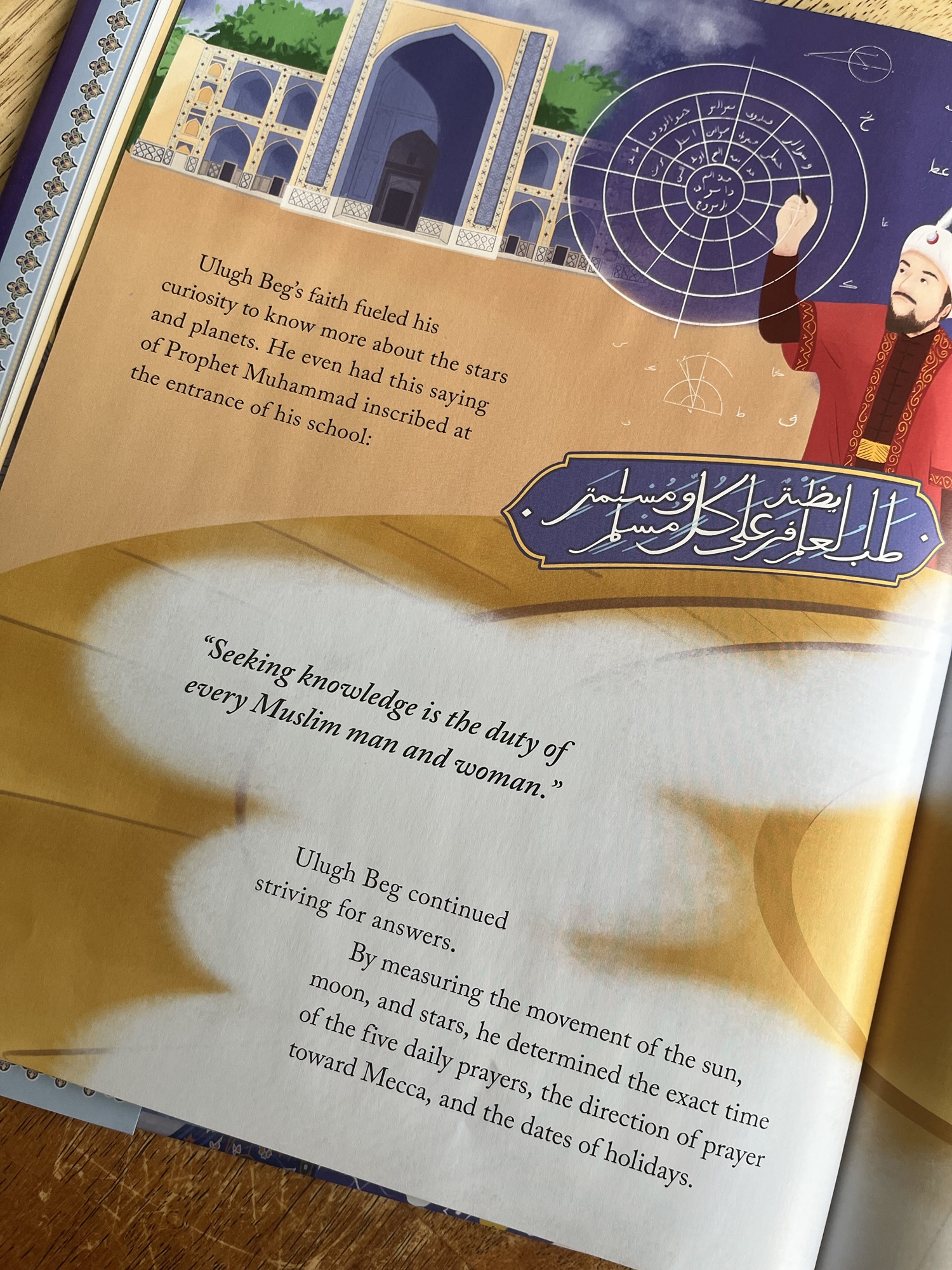I love that faith and Islam is centered and that the inscription on his school is “Seeking knowledge is the duty of every Muslim man and woman.” But it alludes that this is a hadith, and while I agree it is inspired by a saying of Prophet Muhammad (saw), I think adding the man and woman part, where to the best of my knowledge the hadith is just “every Muslim,” is something that should be clarified. None-the-less, that it was Ulugh Beg’s motto, so to speak, and that he made a point to articulate “woman” is remarkable. He determined the exact time of the five daily prayers, the direction to Mecca, and the dates of holidays.