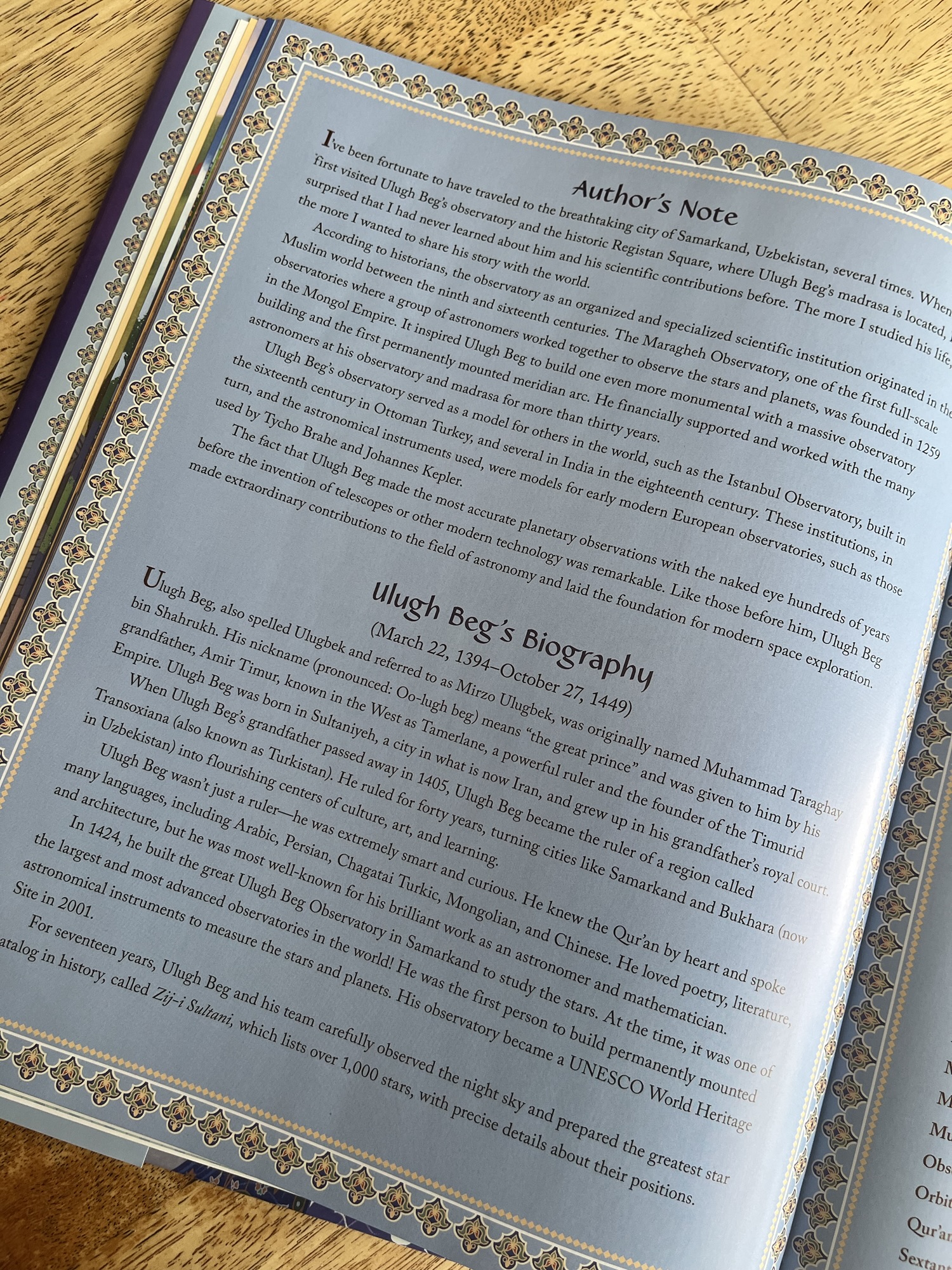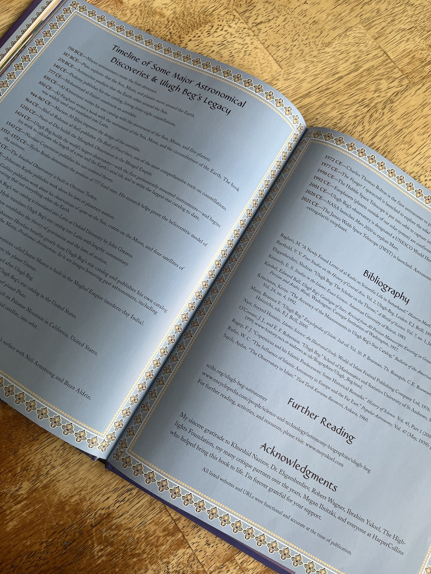 As incredible as the story is, the backmatter is equally impressive with an Author’s Note, Ulugh Beg’s Biography, a Glossary, Astronomical Timeline, Bibliography, Further Reading, and Acknowledgements.