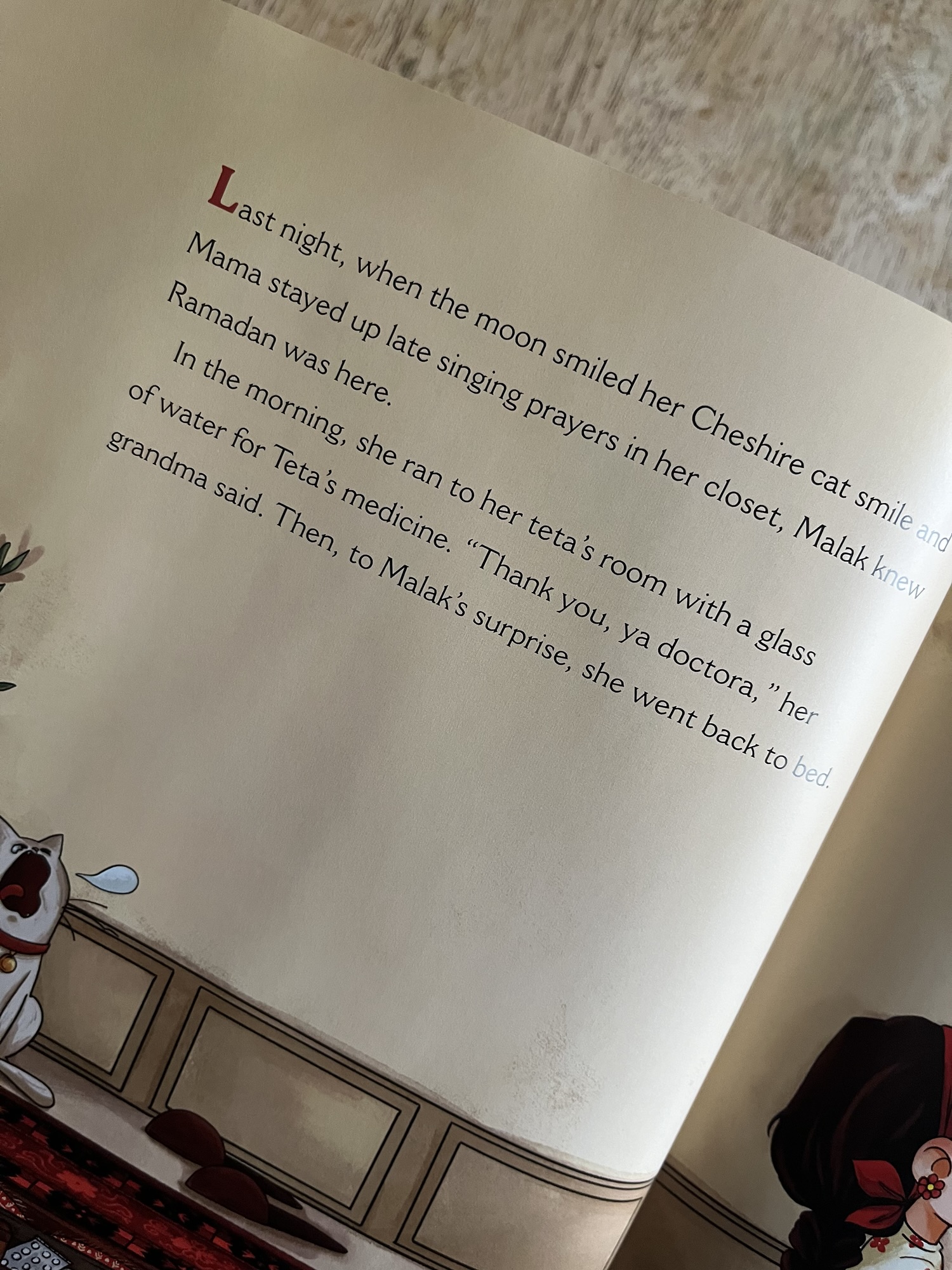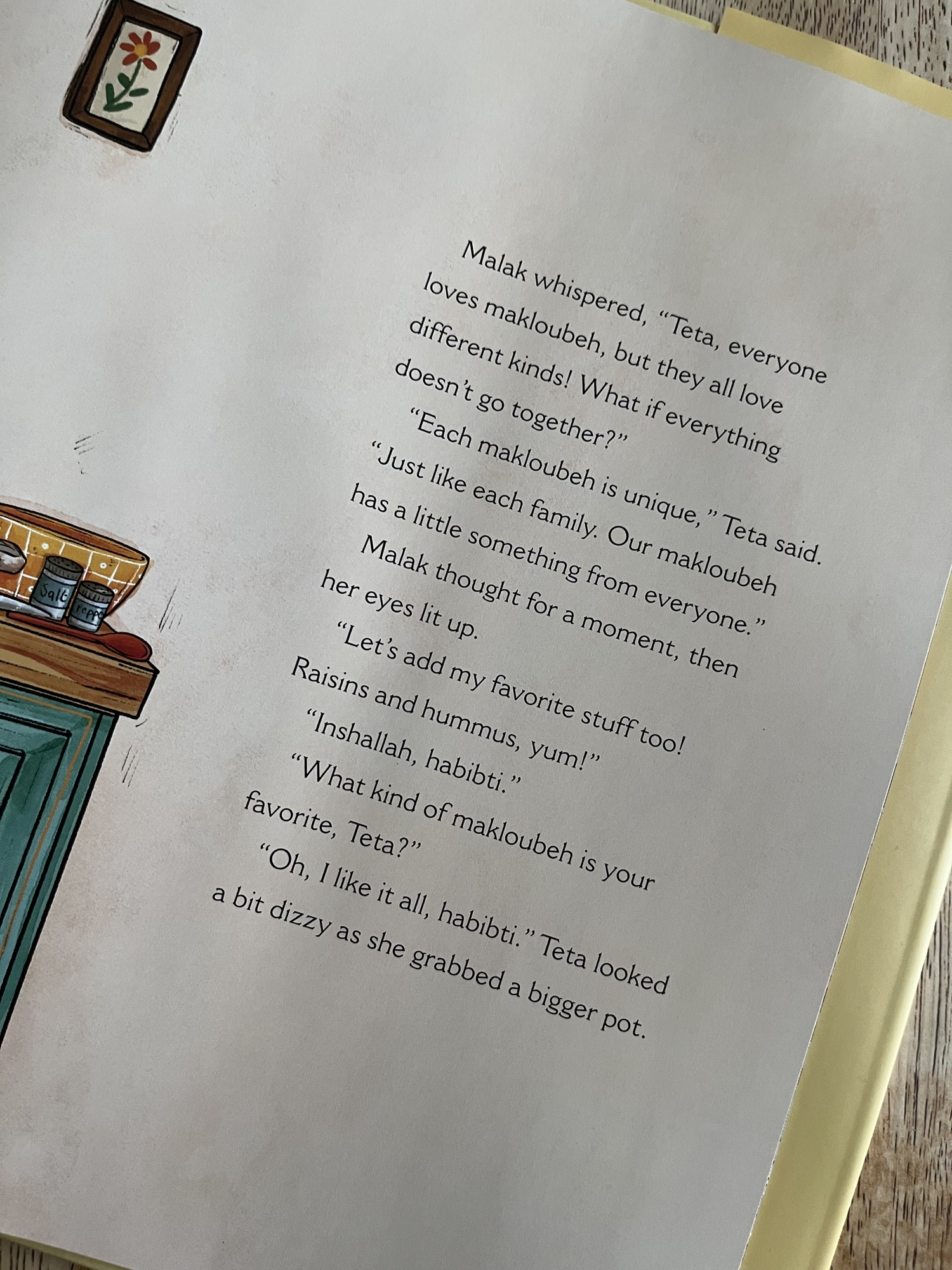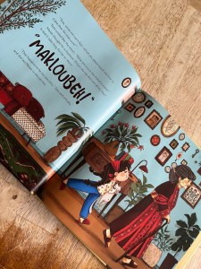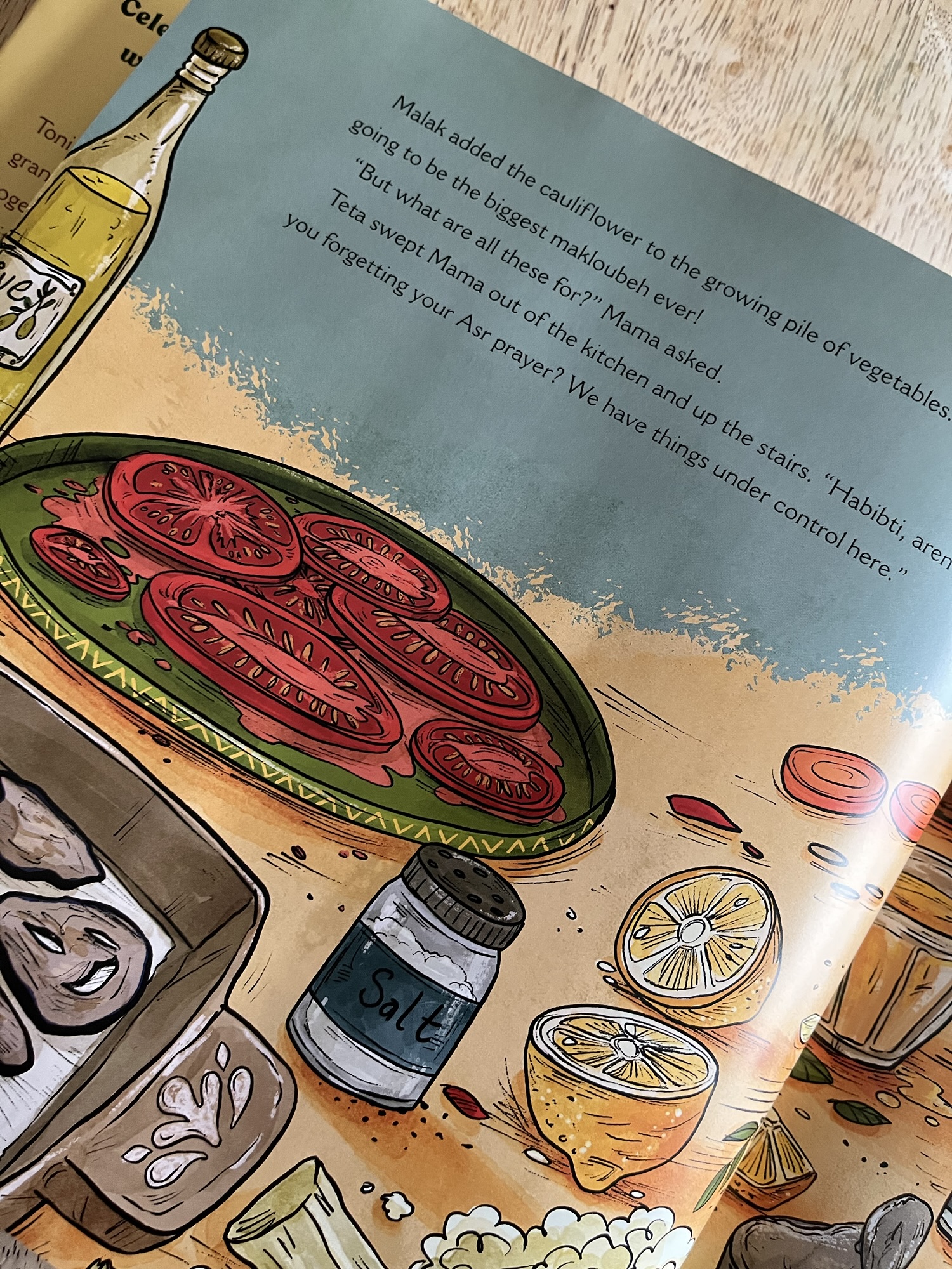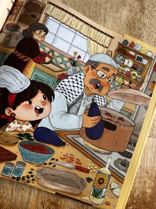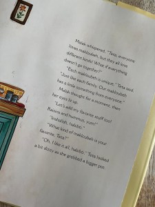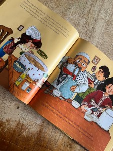 The book starts with the moon smiling her Cheshire cat smile and Ramadan beginning.  This is the first year that Teta is not fasting, and Malak decides she will have Teta teach her how to make iftar, but not just any iftar, upside down Makloubeh!