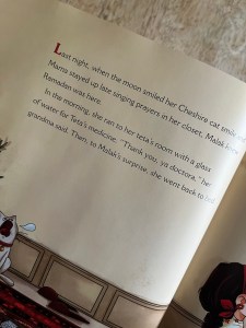 This 40 page book is all the feels as little Haneen’s Ramadan duas change from the material to the heartfelt while the rain pours down, taraweeh prayers are made, fun is had, and hearts are touched.  In true Thompkins-Bigelow fashion the book presents in layers that pull the emotional threads without turning didactic and preachy. The adorable illustrations complement the text and by the page when the characters are crying, I too, found tears in my eyes. I love that praying, duas, and practicing Islam is not sidelined, as current Ramadan and Eid books seem to do, but rather centered and celebrated as a source of comfort and joy. For the most part the external catalyst moving Haneen’s internal change were seamless, but the page with the little boy pointing and calling the drawings on her card naked, seemed a little jarring to the tone, even though I can see the function it served. I also acknowledge that a physical version might not make it as abrupt. Additionally it is worth noting the very nature of reviewing is to over think, so to be completely honest, by about the fifth reading I began to wonder, did her perspective change? There was no pivotal moment that set it in motion, it seemed she just got carried away in making the Eid card and never got to articulate what she really wanted to her mom. The initial dua is for the shoes that the family can’t afford, which I already felt was inconsistent because when asking Allah swt nothing is impossible, and the whole premise is that it is Ramadan and on top of that raining, but that aside, even when she first draws them, she states that it isn’t what “she really wants.”  So now, I’m wondering if anything really changed at all, or she just never clarified and thus the reader as well  her mom are taken along from Ramadan night to Eid day.  Also in the arc I read, it seemed a word was missing on page three that will hopefully be fixed in the final version. I love the tone and the warmth, and I know most won’t read it as deep as me, but the publication is not until March and I wonder, and hope, a few tweaks might still take place.  When my pre order arrives, I will revisit the review if need be, and yes, even with my critiques, I think this is a book that will delight all ages this Ramadan and give plenty to reflect on throughout the year.