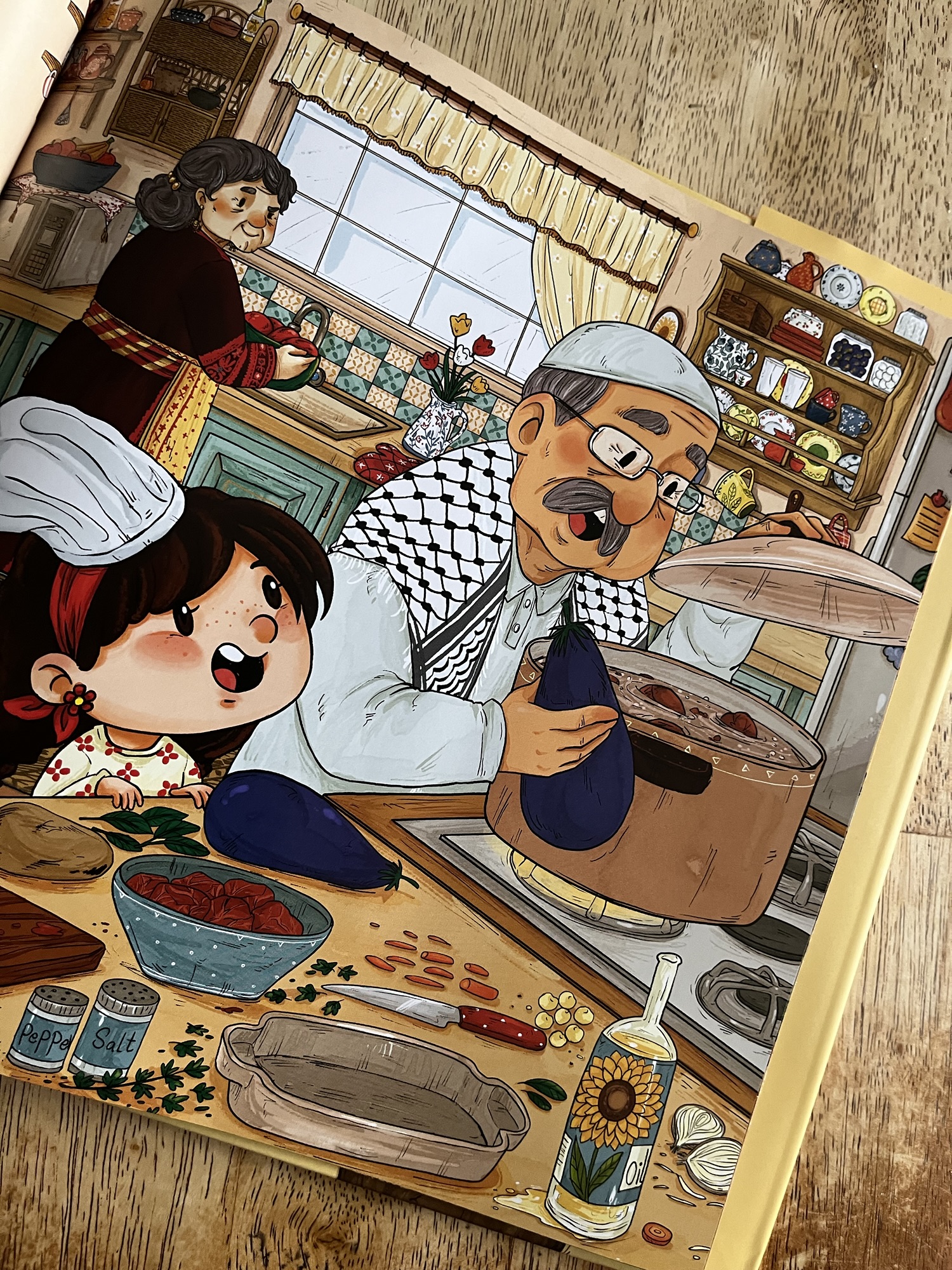 It starts out with Teta explaining the process and getting started, but then Jido comes in and wants eggplant added. Then khalo sneaks in to let them know that he likes potatoes in his. When Mama gets home from work with cauliflower, she is swept off to pray asr, and Malak decides she wants to add her favorite to the mix.