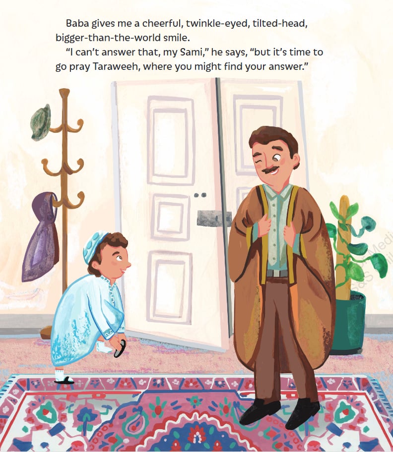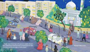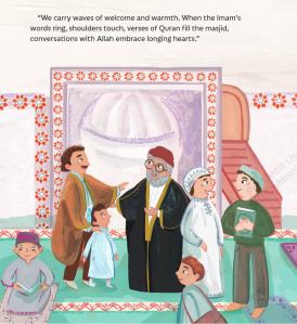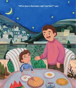 Set in Syria, the book starts with Sami and his father sitting outside eating together, when Sami’s father says that it “feels like a Ramadan night.” Sami isn’t so sure, but his father isn’t about to offer a simple reply, and instead urges him as they head out the door to Taraweeh, to find his own answer. So Sami asks the crescent moon, who tells him that, “Ramadan nights are lights.” Sami isn’t so sure, but but he sees the golden lanterns glittering, and faithful hearts shining and eyes twinkling as his foot steps make noise on the sidewalk. This has him ask the sidewalk next. Where he is made aware of the eager steps, and celebrating streets full of hope. His own feet bring him closer to the masjid where echoes of laughter are heard. The echoes, when asked, speak of peace, and so Sami’s journey continues through salat, playing outside, and delighting in sweets, before returning to his “hug of a home” and knowing in his heart what a Ramadan night feels like to him.