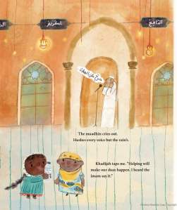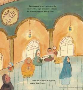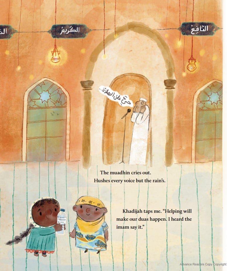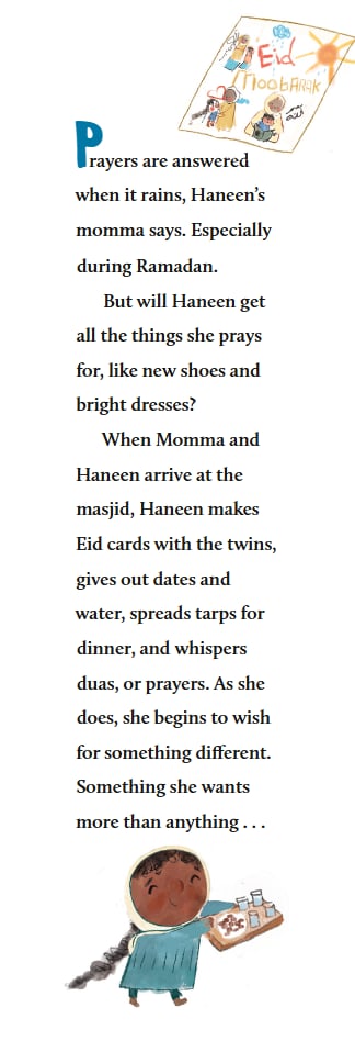 The book starts with a grumpy Haneen sitting on a bus, walking in the rain, and arriving at the masjid a little wet and muddy recalling when they had a car and things were easier. She starts to complain but catches herself knowing that they can’t afford things, and Momma tells her that, “rain brings blessings.” She also reminds Haneen that duas said on a rainy day get answered, especially during Ramadan.