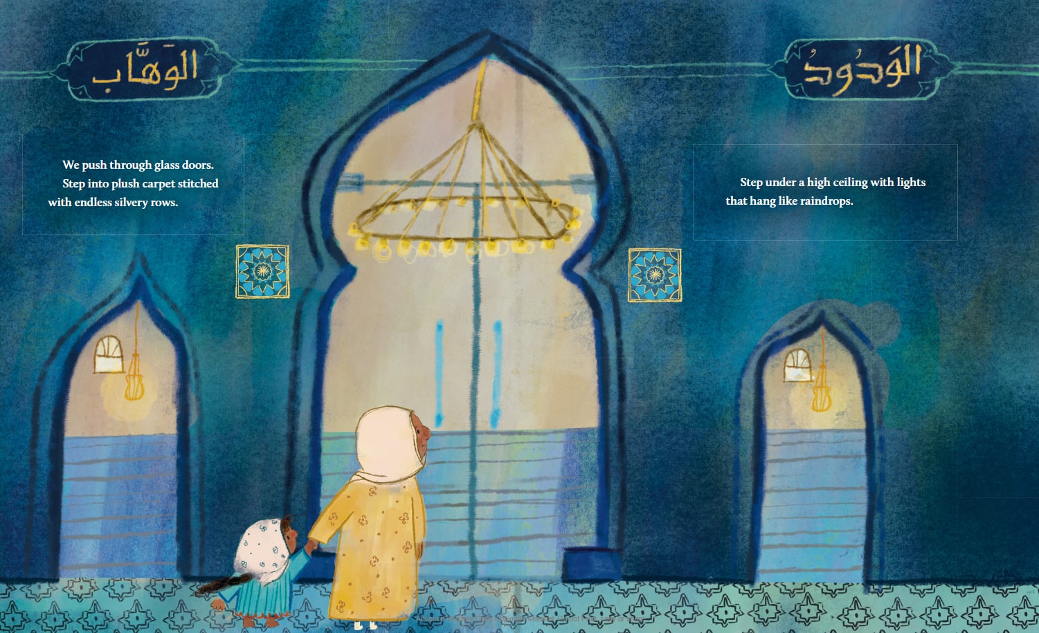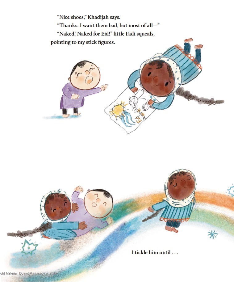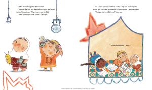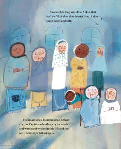 Once in the masjid, Momma reads Quran and Haneen starts to make duas for the shoes she wants but knows they can’t afford when she is distracted by friends, and they start making Eid cards. They children work together, and when it is pointed out that Haneen’s stick figure has shoes, but no cloths, she marvels at the different dressed women around her, before adding her favorite to the picture, wondering if she can get new clothes for Eid. The pattern continues, she sees the twins with plush toys, and thus plushies are added to her wants, and filled in on her Eid card, as the congregation moves from athan, to iftar, to salat, to taraweeh.