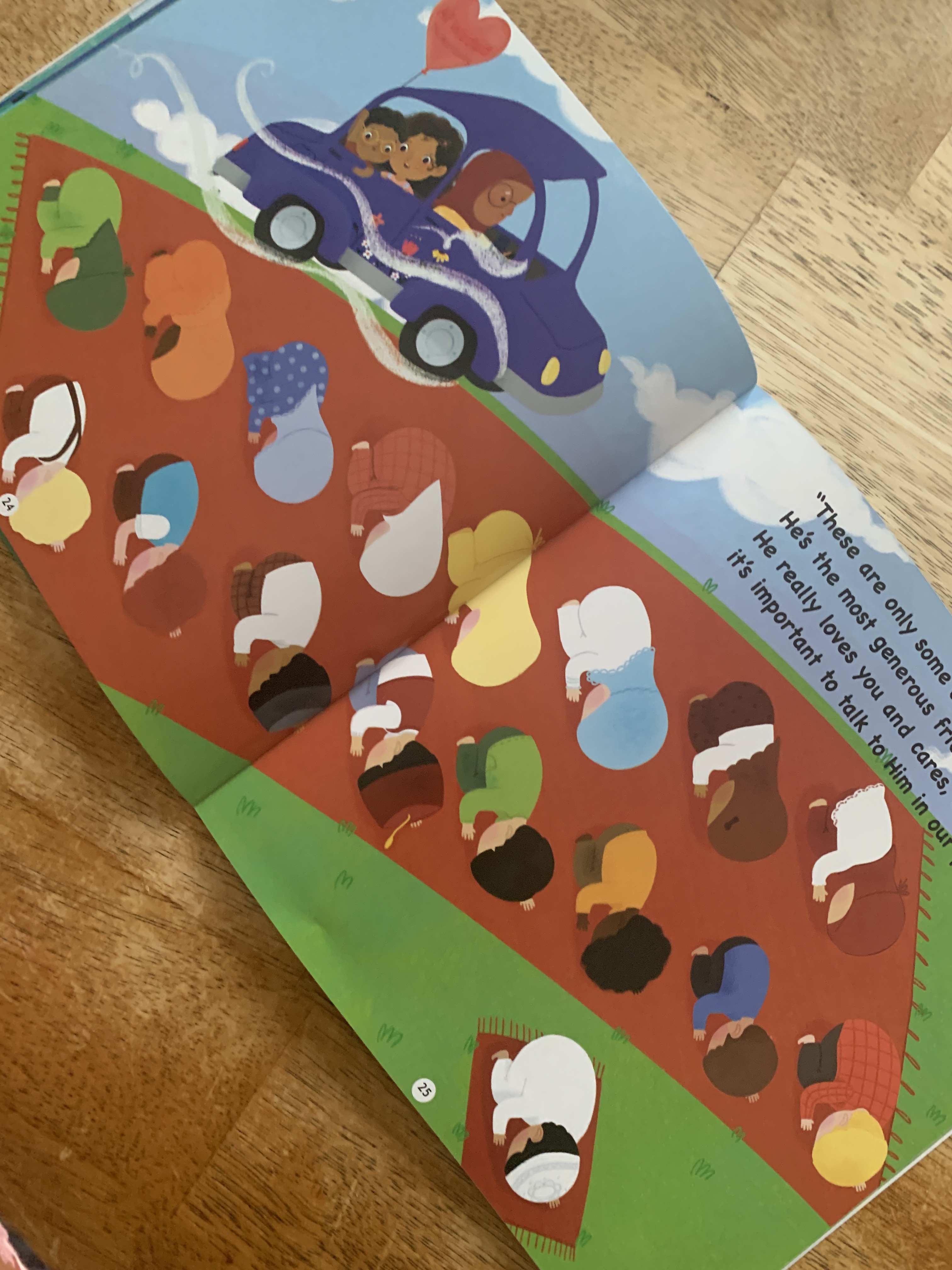 The book starts out with a young boy and girl excited to be spending the day with their Granny and going on a ride in her special car. No idea why it is special, but it is purple and has flowers painted on it, so lets go! The kids love to ask Granny questions when they drive. So after saying bismillah, they wonder why people don’t have tails or shells on their backs, or where they are going, or if they can have ice creams.