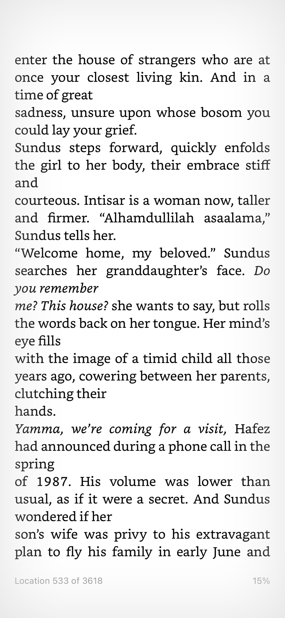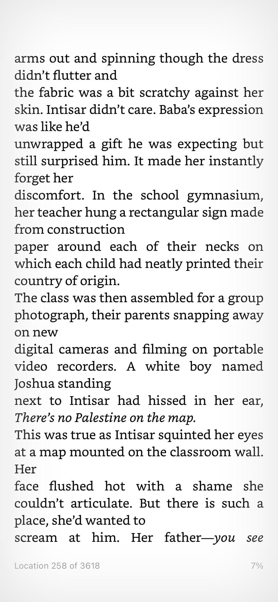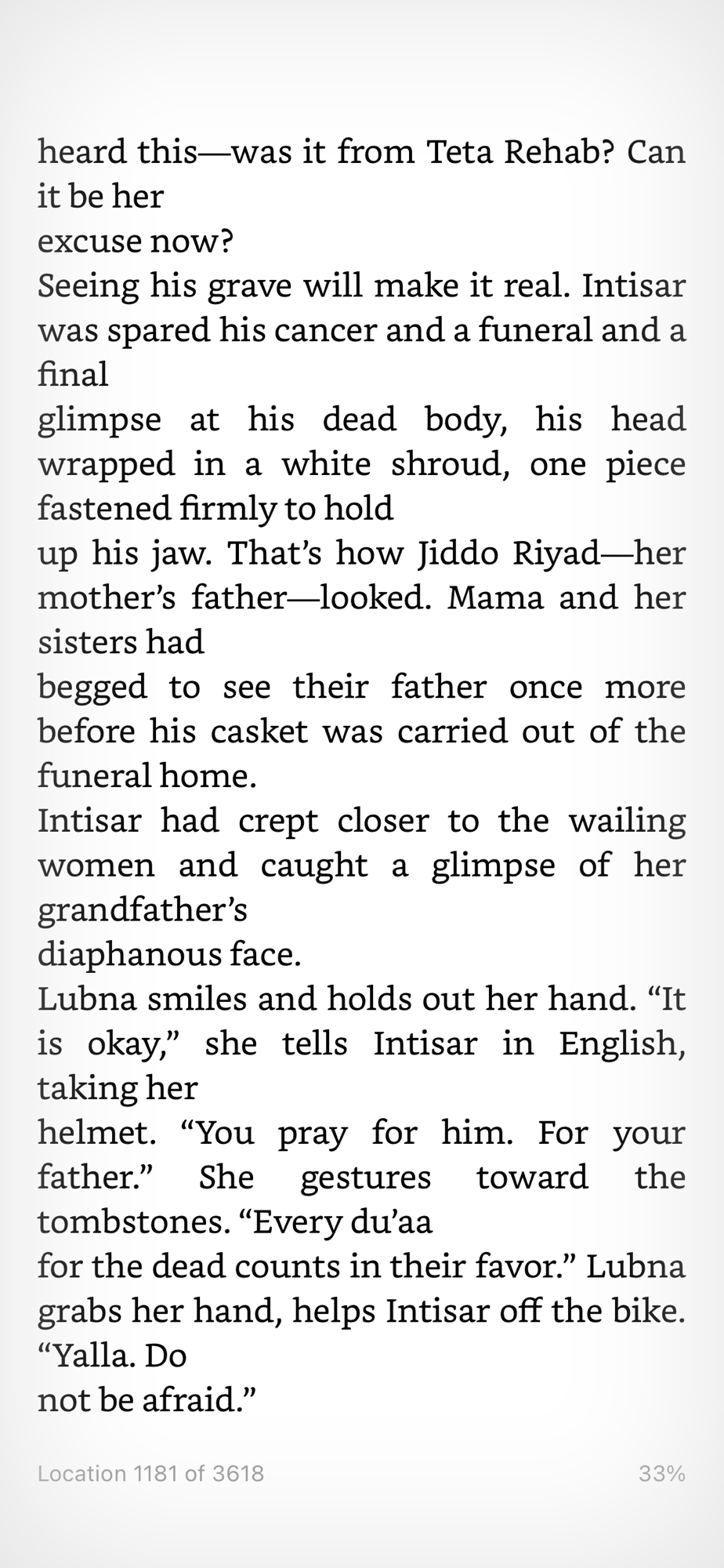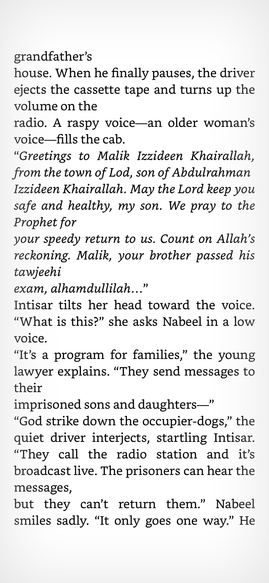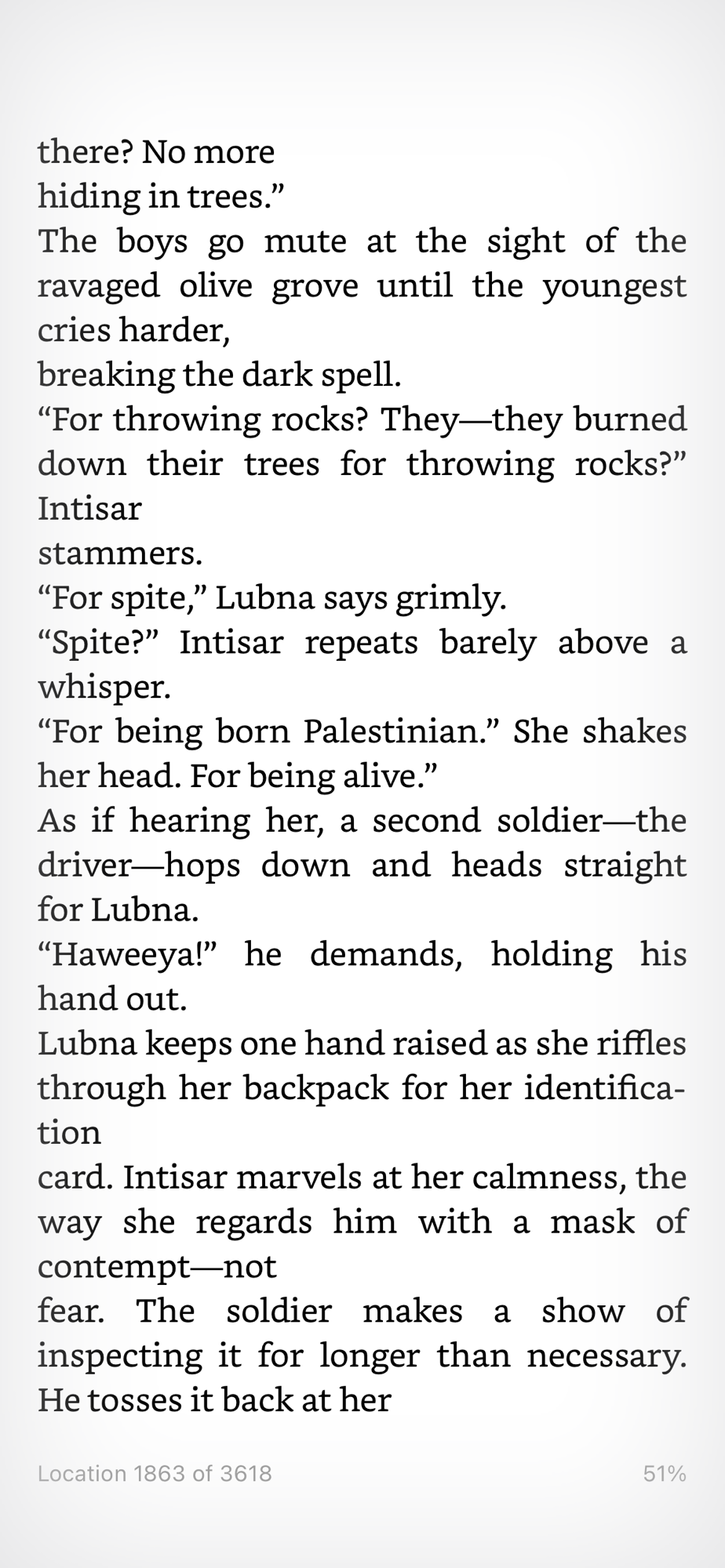 This adult multi generational novel weaves a narrative that will stay with the readers for the warmth and depth it explores of a fictional family that over the course of 248 pages becomes very real, and in many ways familiar through its personal focus. The book is deliberately slow as it glides through different members of the family, their backstories and different points in time. The prose highlights the plight of Palestinians but not in a didactic or call to action sort of way. The characters and their stories, and their trauma and dreams are very tied to Palestine and the occupation, but the focus on the individual and the ripple effects is what will linger. I do not know when the book was written, (it is published in November 2025) as I read a digital arc which had very minimal backmatter, but this book is set before the recent genocide and is all the more important for today’s readers in pushing back against attempted erasure of Palestinian voice, culture, and history.