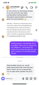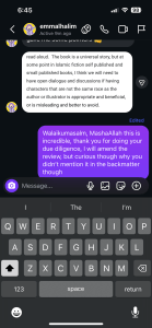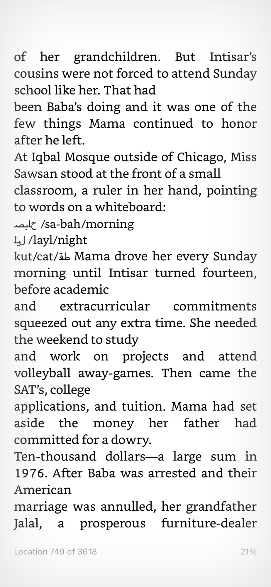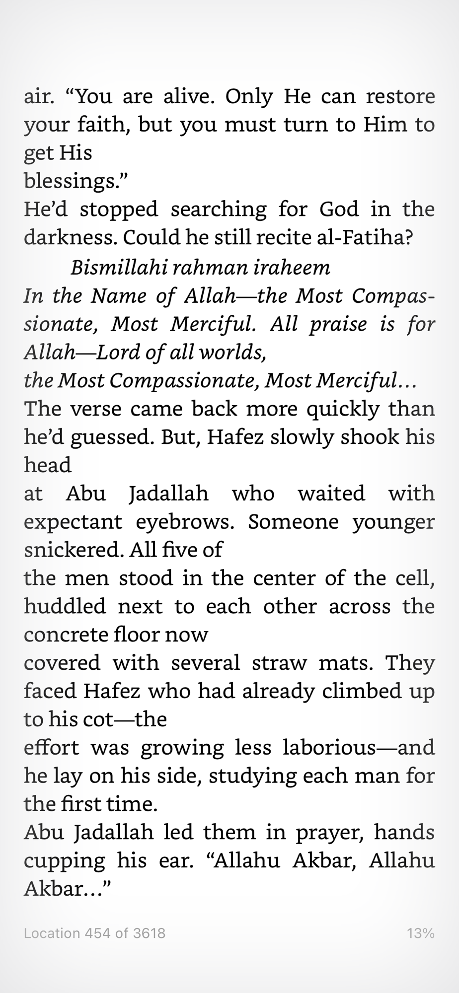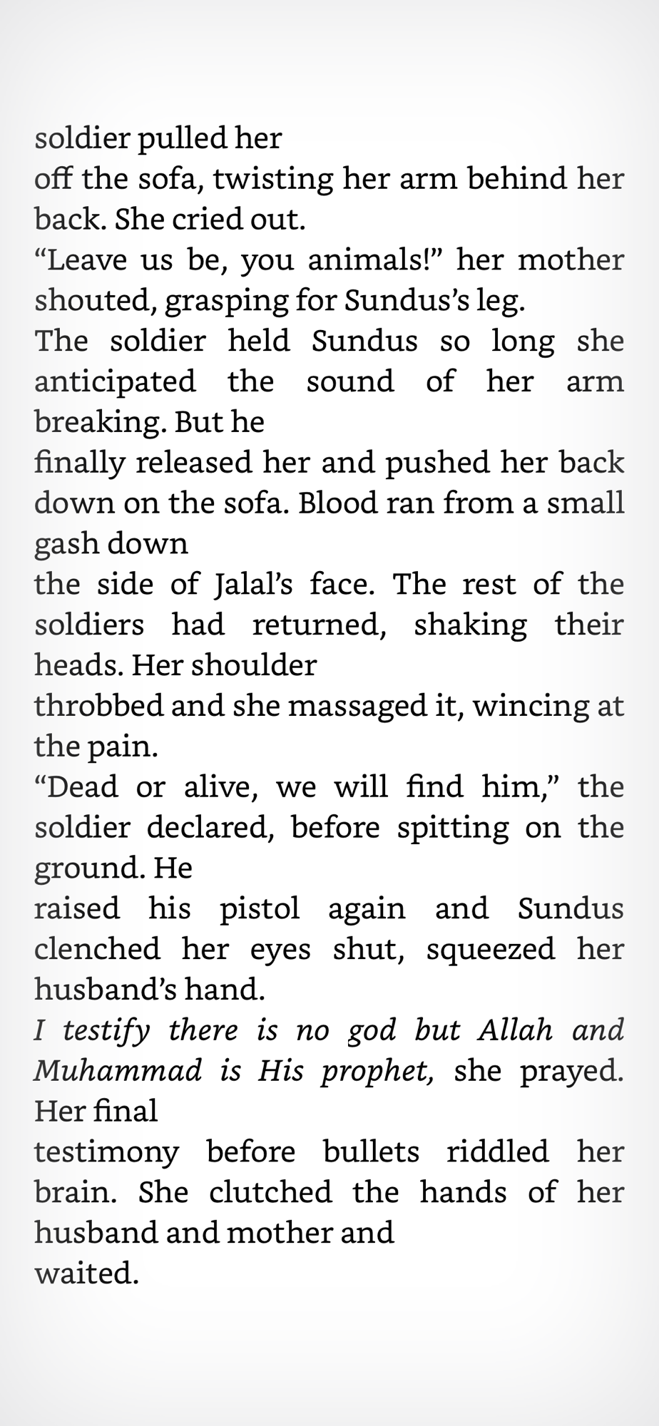 Again I read an arc, but there are a few sentences that really have me hoping line edits will still occur before the final version. The book is adult, it has a Muslim drinking and serving alcohol, there is assault, sexual and physical mentioned, and yet I didn’t feel like it was sensationalized, actually felt that the author was deliberately holding back to keep the story about the family and not the larger issues. Their is quite a bit of Islam, not from every character, but it is woven in and not an identity issue. Actually one line used frequently is my only real gripe with the book. “Pray to the Prophet,” is regularly said by a few characters, so I though perhaps it is something unique to them, up until about the midpoint, where many characters start to say it and I don’t like it. It makes it clear other places that Allah swt is One and who we pray to, it has the shahada in English and verses from the Quran, so I’m guessing it is a colloquialism perhaps, or maybe a poor translation, I honestly don’t know, but it bothered me, so I am sharing.