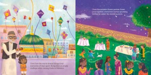 A young girl begins the book telling of things she loves: trips to Pakistan to fly kites with her Dada, her mother’s dinner parties, swimming, climbing trees, but most of all she loves basking in the sun.  One day while playing with her friend Zoya in the warm sun, Zoya abruptly says she should go in before she gets too dark.  The protagonist counters that she loves all the shades her beautiful brown turns and equates it to magic.