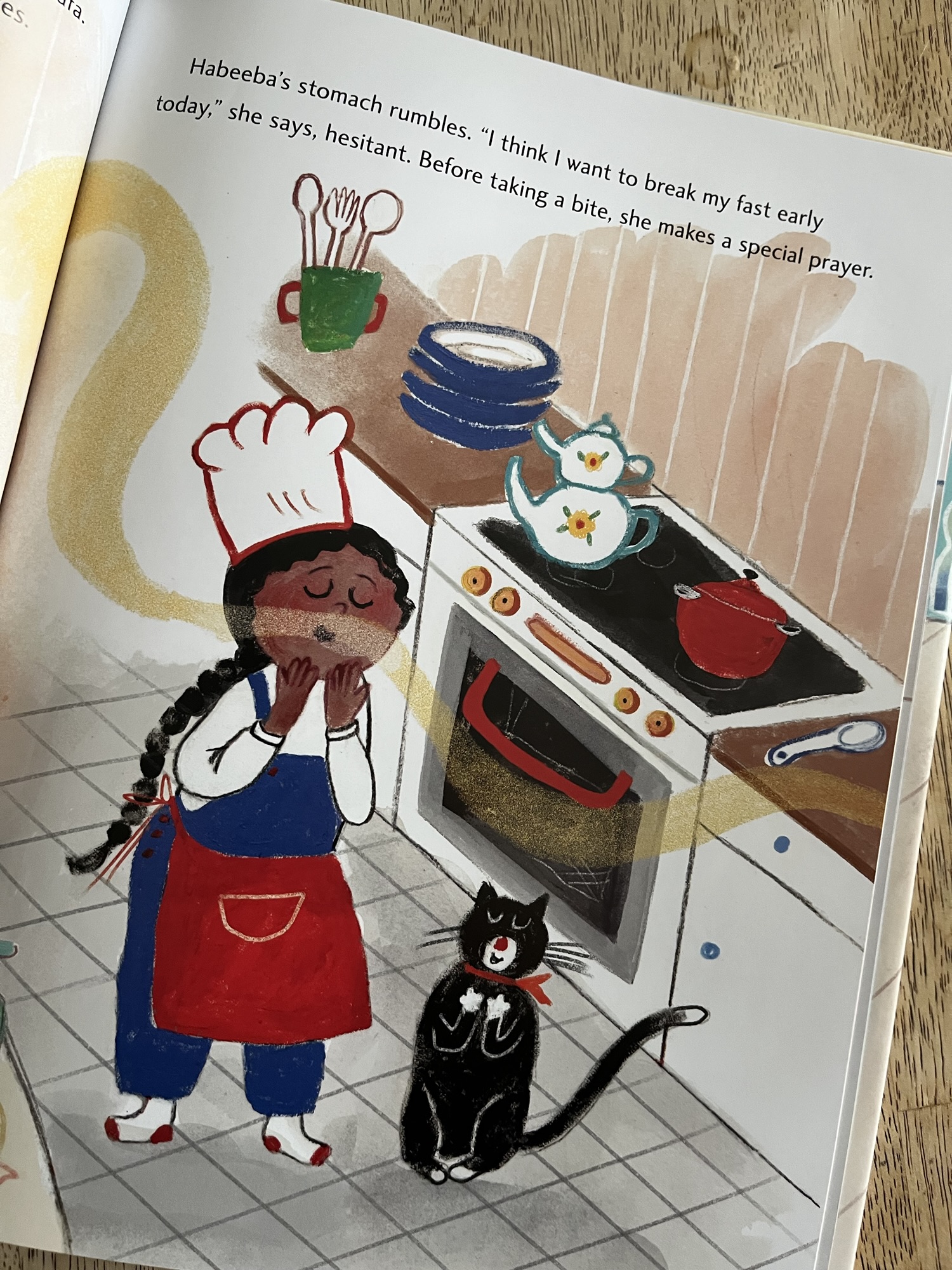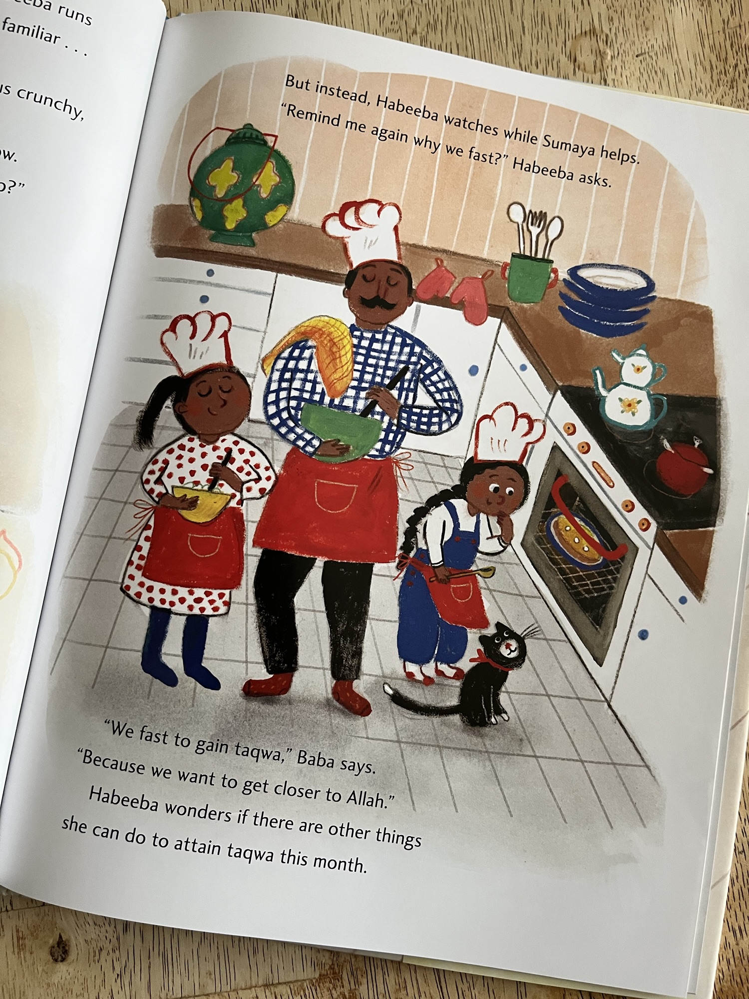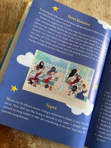Had the book not been checked by a named Shaykh who consulted on the story, I’d be a little more worried about the messaging that we fast for taqwa and not that we fast because Allah swt commands it, and that when we do fast we foster that closeness to Allah. I also found it odd that the backmatter says Ramadan is “set during the ninth month.” Ramadan is the ninth month.
