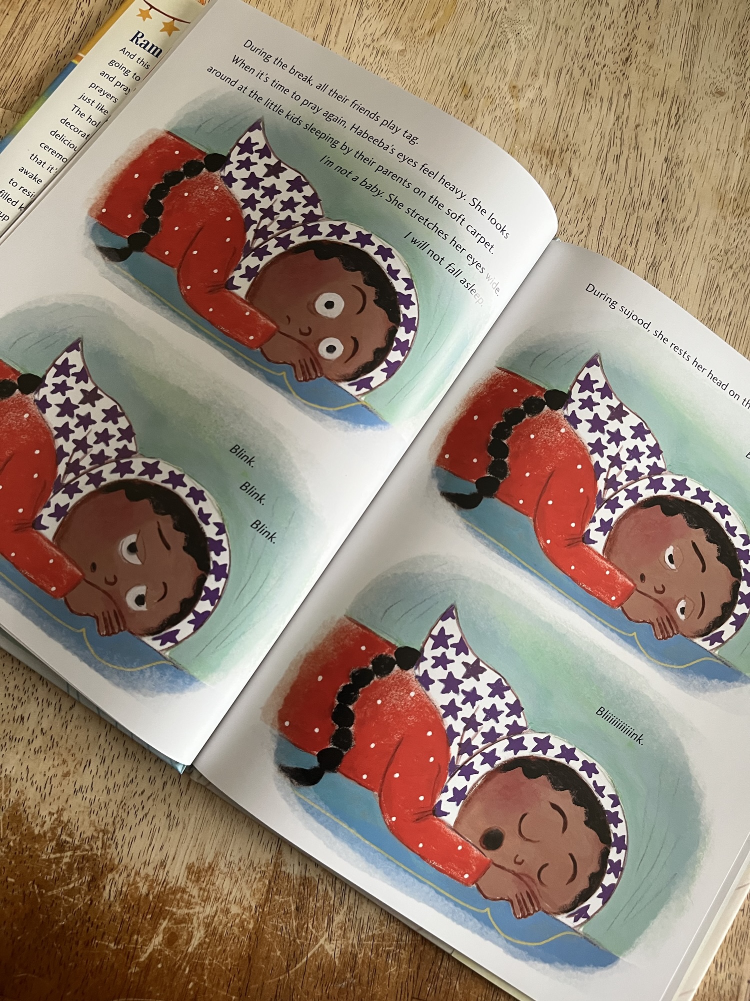 Later at the masjid, the little boy in front of Habeeba makes focusing on duaa hard, and when she is in sujood, she finds herself drifting off to sleep. Day after day she struggles with the temptations of delicious treats, and slipping off to sleep in the comforts of the masjid at night.