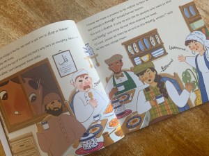 This hardback Muslim authored, Muslim illustrated anthropomorphized book takes the shape of a moral fable in which Elephant has no friends, attributes it to her appearance, forces the insects and animals around her to give her their eyes, waist, nose, arms etc., and then when they still don’t like her is persuaded by ant to return the body parts, apologize and be content to be ant’s friend.