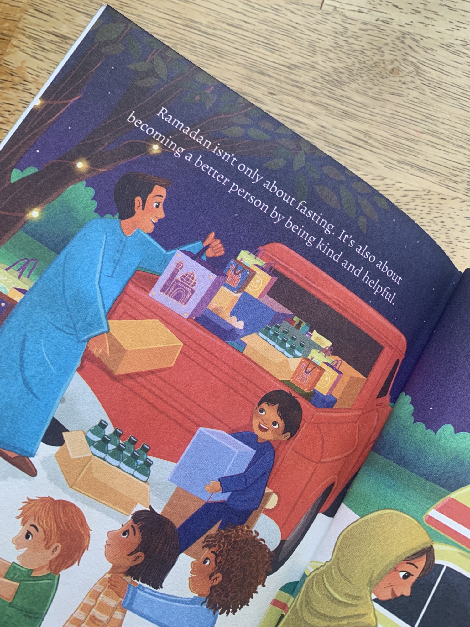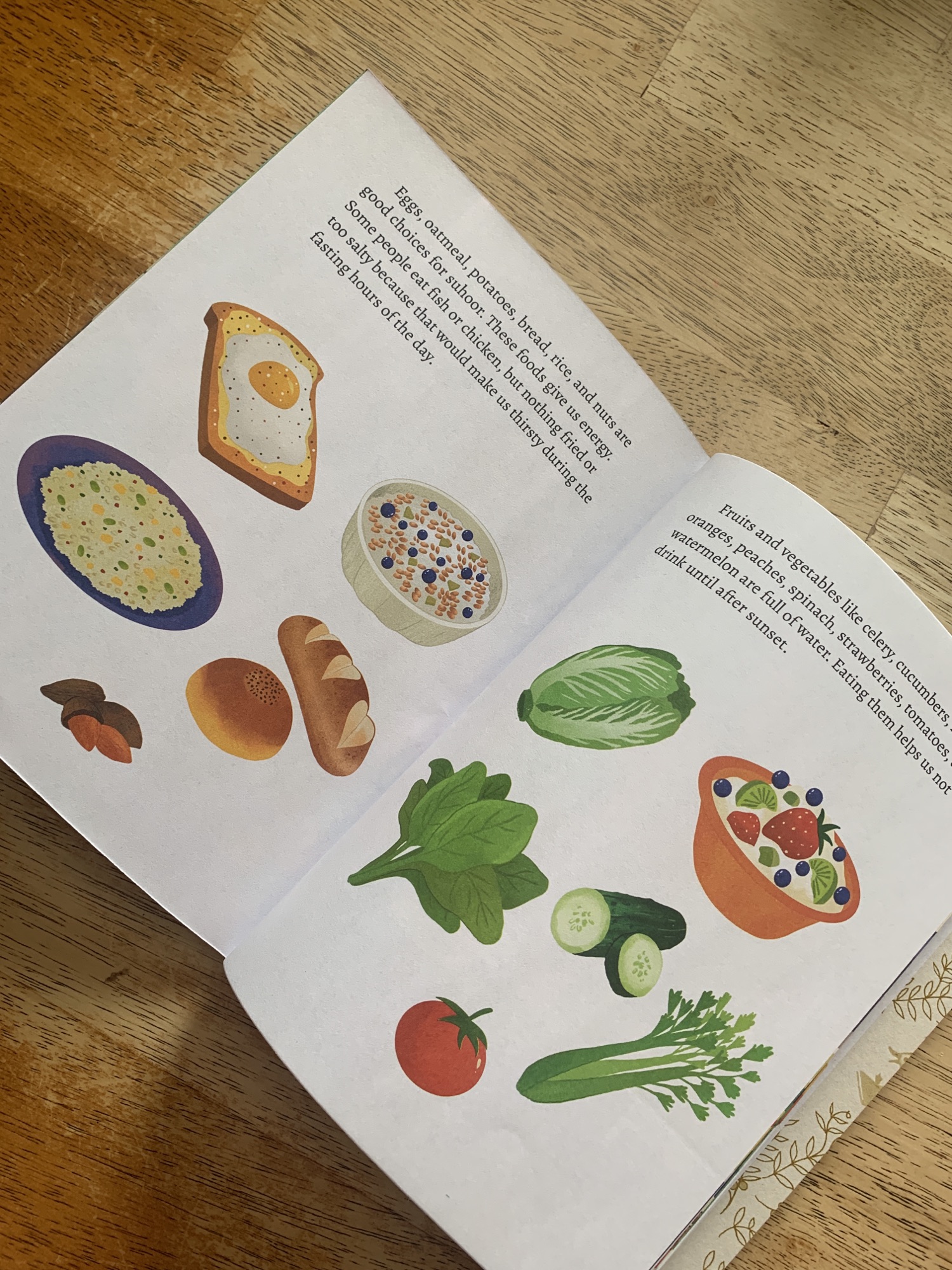I would not know where to shelve this 40 page in a library, it has beautiful pictures, it is informative, resourceful, useful, and interesting- I’ve only delayed sharing it because I really have had to think, how best to use this book to its maximum potential, to make it truly effective. It is formatted externally as a picture book, but it reads much like an chapter book anthology with the stories connected by the road the diverse folks live on, Rahma Road, all coming together for a communal iftar, with some fasting and some not. The spreads feature vignettes on the left of what each house is making, including tidbits of culture, facts about Ramadan, insights about method or ingredients, with the facing page being the recipe. The book is incredibly meticulous and intentional in appealing to Muslims and non Muslims alike, as well as a variety of ages. It works as a book for Muslims to see themselves in, non Muslims to get a peek at iftaar excitement through, messages about community and diversity celebrated, foodies to see new recipes that they can try, cultures to explore through food and native words, a story framing to feel connection, I really could go on and on with the layers and inclusions this book provides, alhumdulillah. I think the best way to use and share the book is going to be for me to read it with my 5 and 9 year old children a week or so before Ramadan. Where I can read the story portion, getting us excited for Ramadan, slipping in some reminders, appreciating Islam’s global presence, and then talking about the recipes so that they can pick dishes to try in Ramadan and add needed ingredients to the shopping list (I wish I made the effort to be this organized all year long). I then will plan to leave the book out and have my teens flip through to find any recipes that they think sound good and will commit to making. The book would work all year long, but as a new release, I’m sharing my plan with hopes that it can help your family as well.