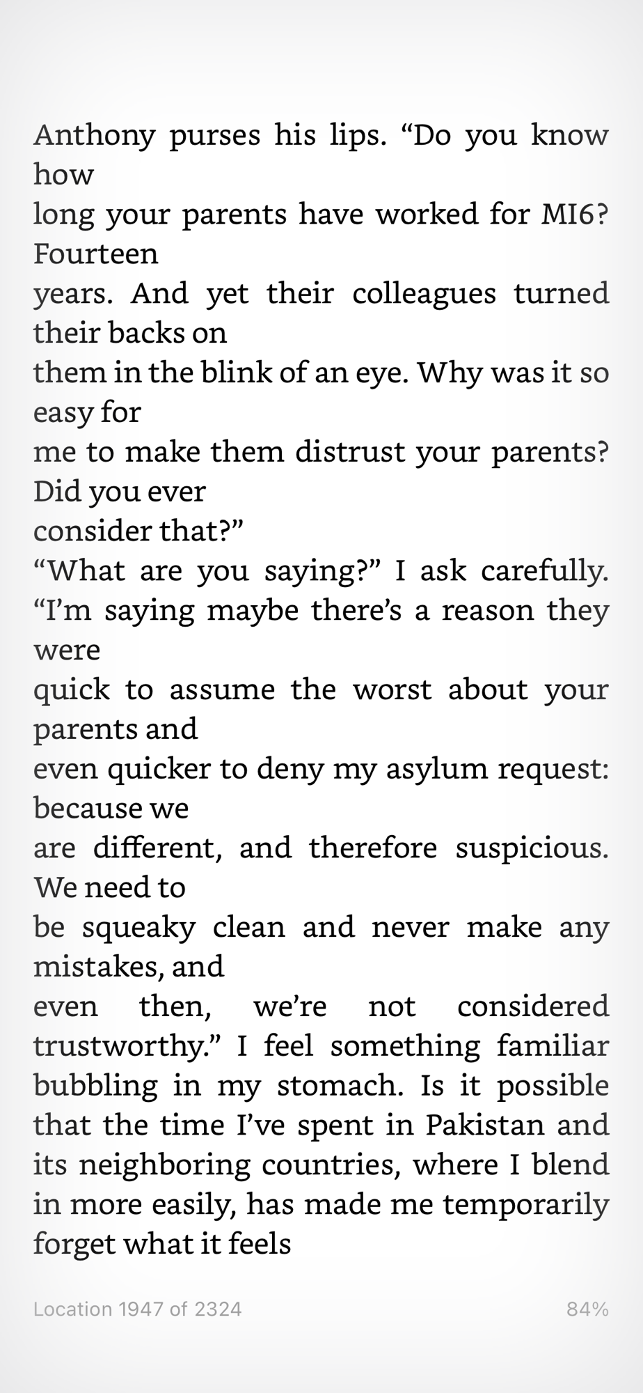 It’s hard to review a book like this without giving the twists and climax and resolution away, but more than once I gasped in delight when something happened on the page, and it crystalized where the book was going in my head. Sure there were some particularly outlandish connections and a few plot holes, I even Googled when fax machines were invented, but I had a blast reading the book. I loved the historical backmatter discussing the events in post partition Pakistan, a year before Bangladesh was independent, Soviet Union and UK competing over influence in Afghanistan, the discontent voices in Iran toward the shah, and the role of the Pudding House for messages in Turkey. There are also discussion questions, a glossary, acknowledgements, and about the author at the end.