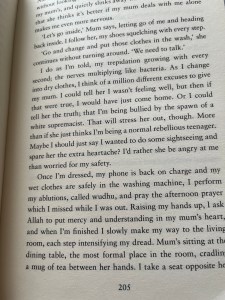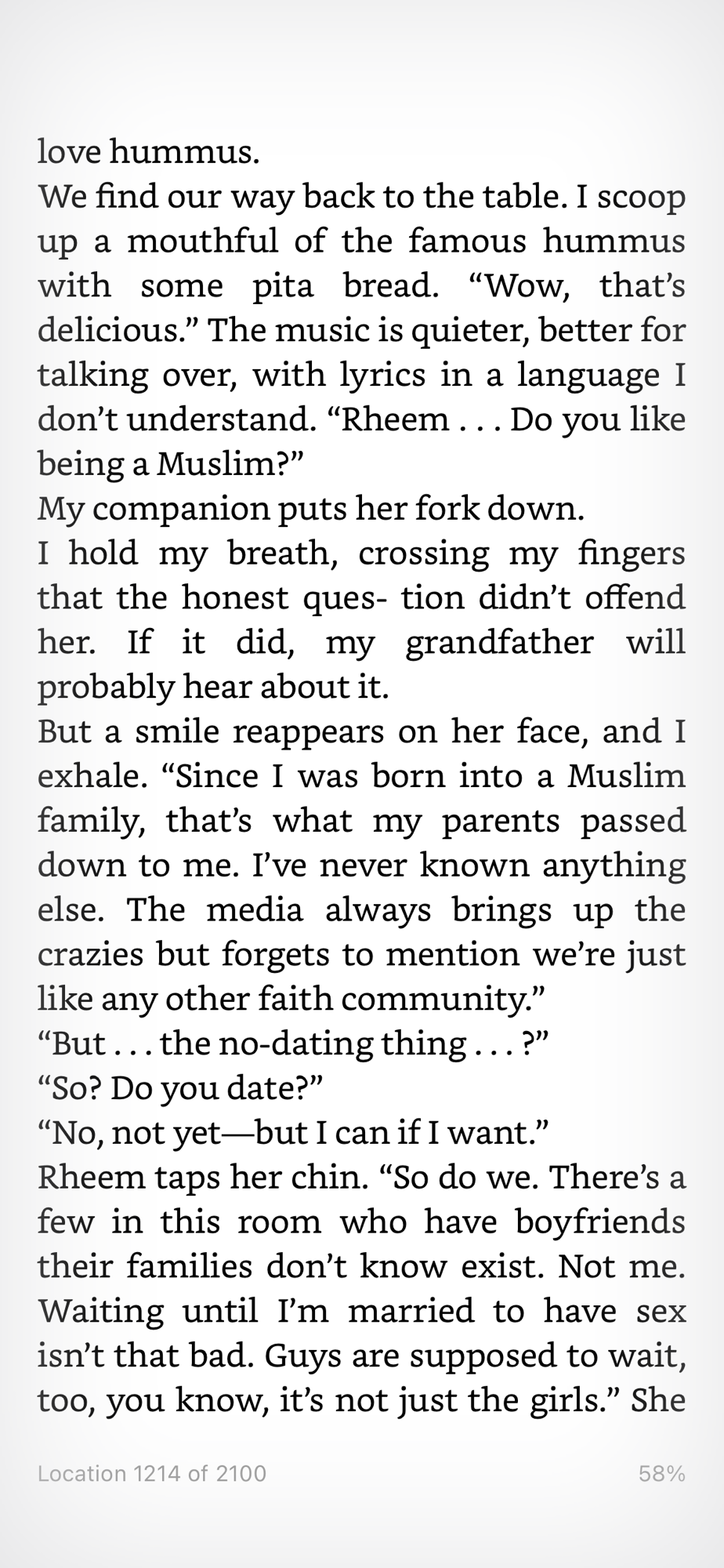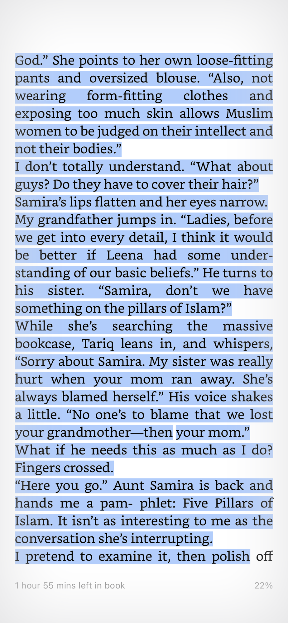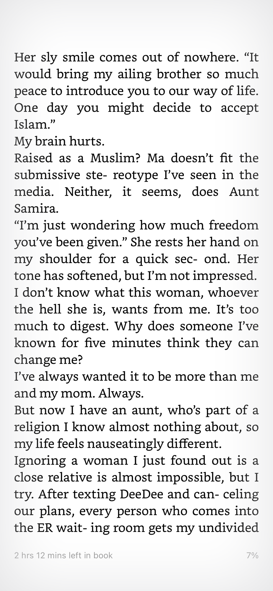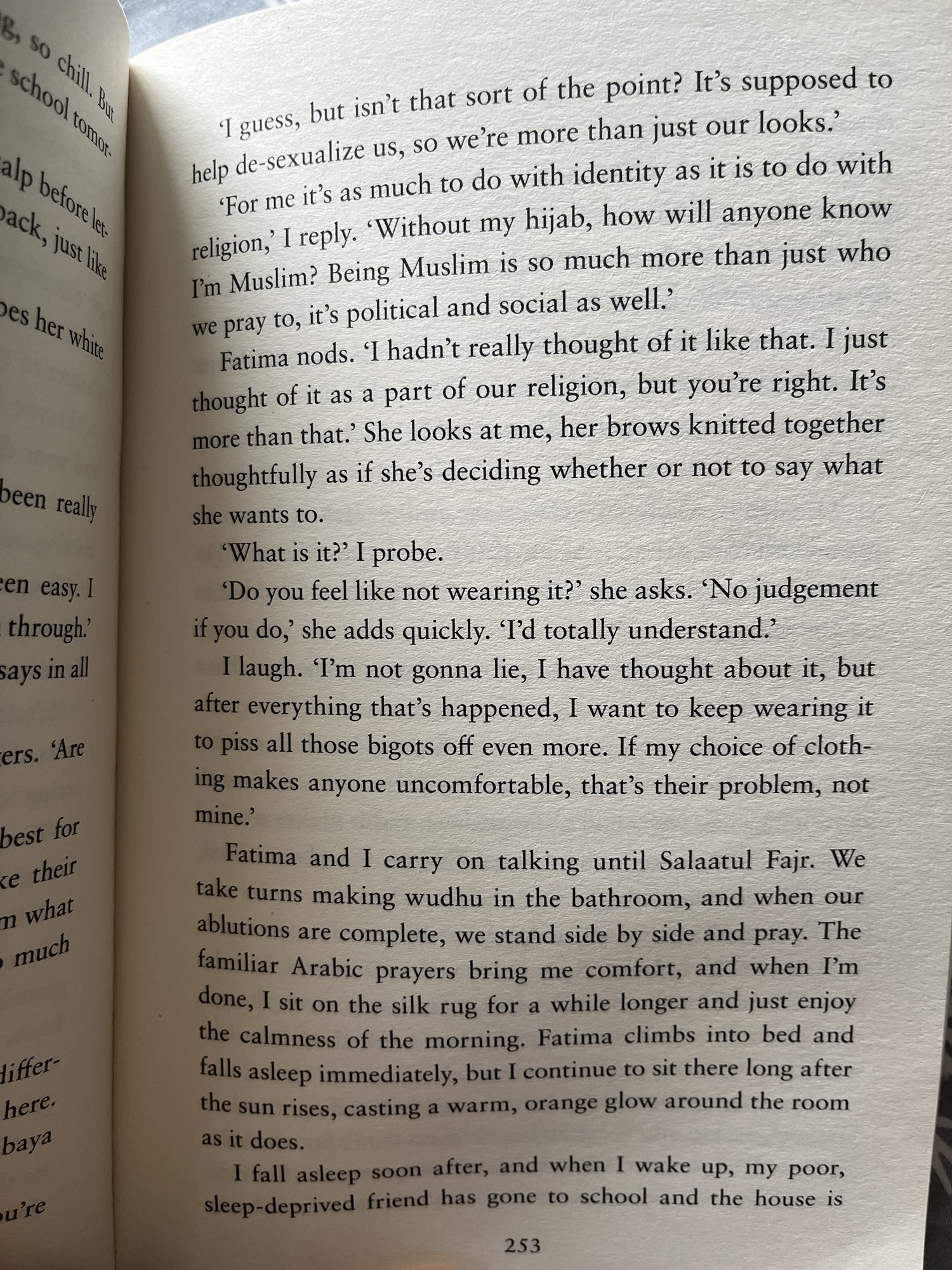 Islam is presented through the harshest of harsh characters, a few side characters are brought in that make Islam more realistic in practice and fleshed out, but it really feels like it is too little too late. I think a non Muslim would feel Islam is just modest dress, no interacting with boys, marrying early, and rigid rules. Leena is harassed from the first moment she meets her family, no easing in to it, she is even handed brochures on her first visit to her grandfather’s home. Yet, Leena never shows any interest in learning about Islam, she could Google it if she was curious, even when at the masjid, she doesn’t go and watch them pray, no connection to Allah is ever discussed, it is just dos and do nots. Consistently throughout it feels like Islam is weaponized and perhaps that is the author’s experience or intent, but it is odd coming from a Muslim writer in a fictional setting. We get enough of that stereotyping from the non Muslim real world.
