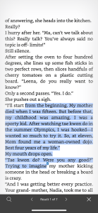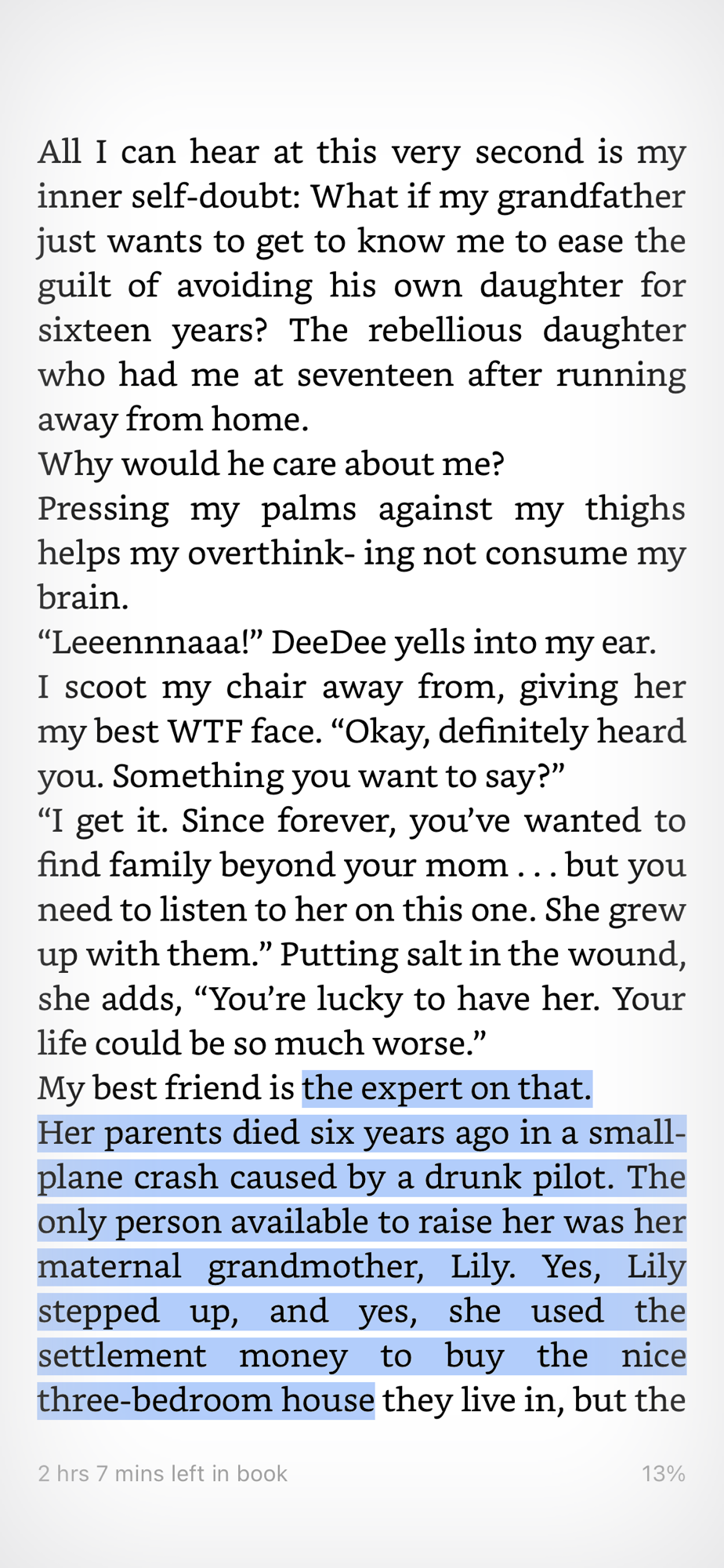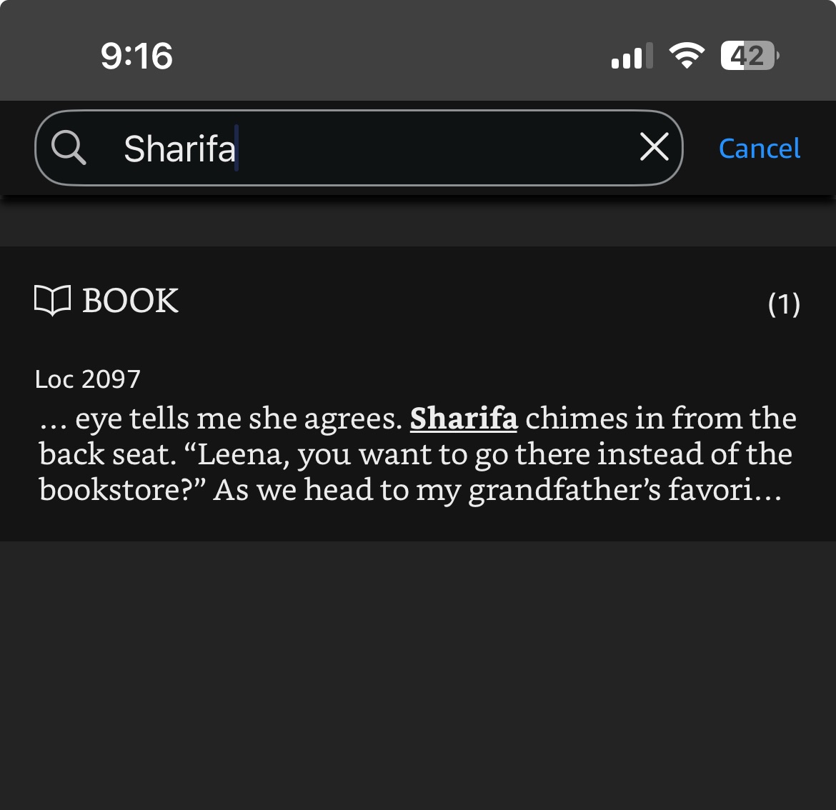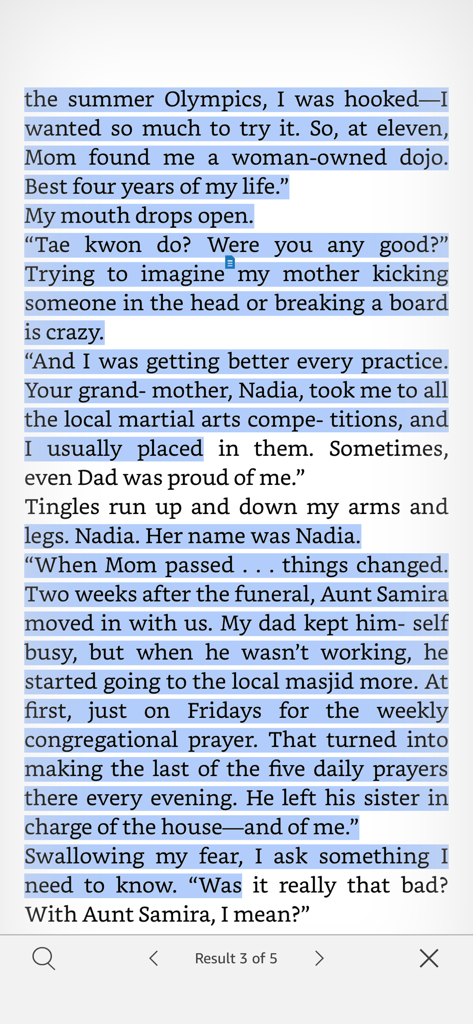I like that family drama and secrets were teased, even if I didn’t think that they were presented and resolved well. I wish they took more of the focus and that Islam being a reason for the animosity was downplayed. I think religion could and should have been one of many factors, having it be the ONLY factor put a lot of pressure on the presentation, which fell short. It also means that the resolution needed to resolve the Islam hanging in the air, SPOILER, it didn’t. The conclusion has Asiyah realizing her father never stopped loving her, but how did that resolve the relationship with her and Samira? And suddenly Samira just backed off her singular Islamic identity? A bit of whiplash with it all happening off the page, left me unsatisfied. Speaking of pages, the book spends a lot of page space having characters drive the one hour one way to have conversations that are less than 15 minutes and could have been done over the phone or even texted. Nothing exciting or revealing comes from these drives, they just make the story drag. Tariq should have ridden along, so we could see why he was “such a great man,” see why Leena kept enduring the harshness of her Aunt to get to know him, and have the family she always dreamed of.
