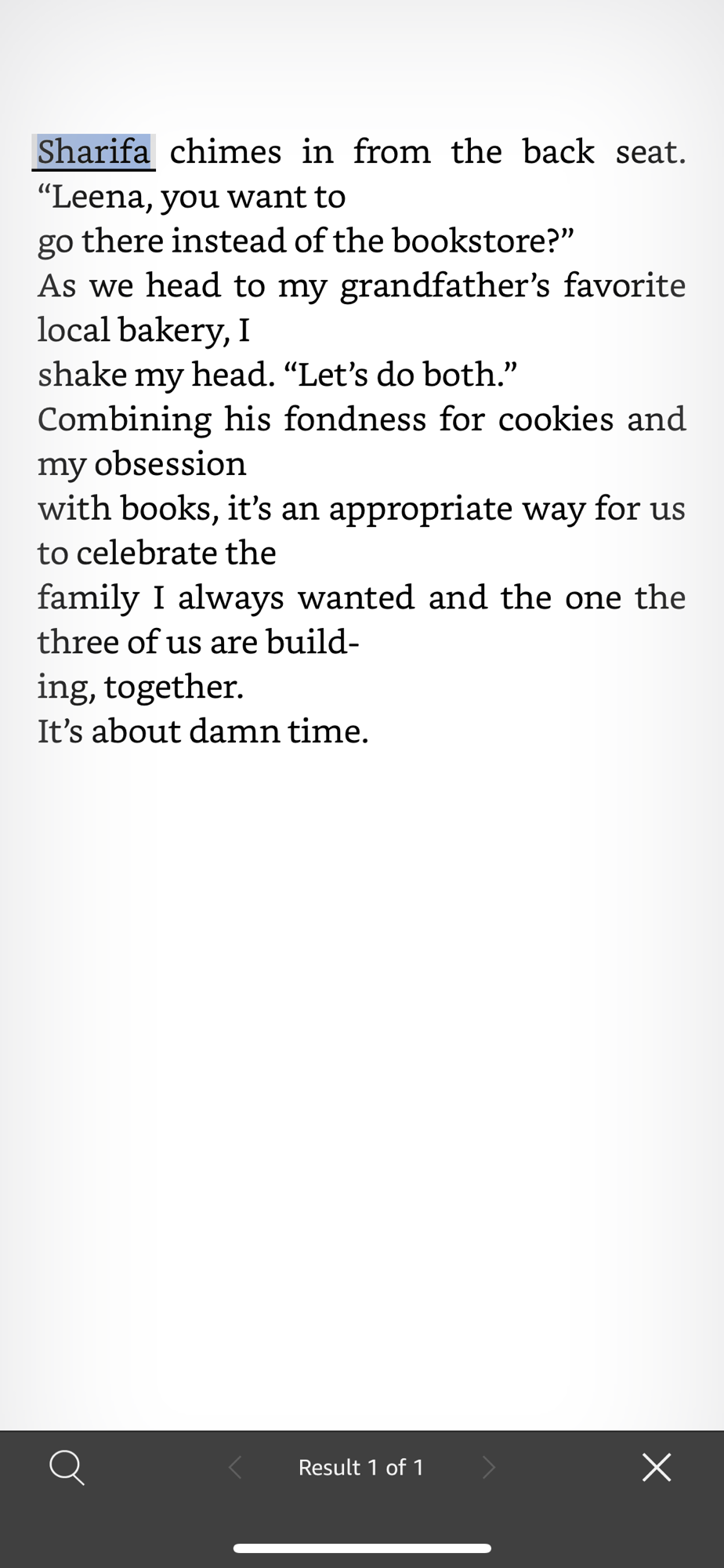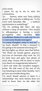 I like that family drama and secrets were teased, even if I didn’t think that they were presented and resolved well. I wish they took more of the focus and that Islam being a reason for the animosity was downplayed.  I think religion could and should have been one of many factors, having it be the ONLY factor put a lot of pressure on the presentation, which fell short.  It also means that the resolution needed to resolve the Islam hanging in the air, SPOILER,  it didn’t.  The conclusion has Asiyah realizing her father never stopped loving her, but how did that resolve the relationship with her and Samira? And suddenly Samira just backed off her singular Islamic identity? A bit of whiplash with it all happening off the page, left me unsatisfied.  Speaking of pages, the book spends a lot of page space having characters drive the one hour one way to have conversations that are less than 15 minutes and could have been done over the phone or even texted.  Nothing exciting or revealing comes from these drives, they just make the story drag. Tariq should have ridden along, so we could see why he was “such a great man,” see why Leena kept enduring the harshness of her Aunt to get to know him, and have the family she always dreamed of.