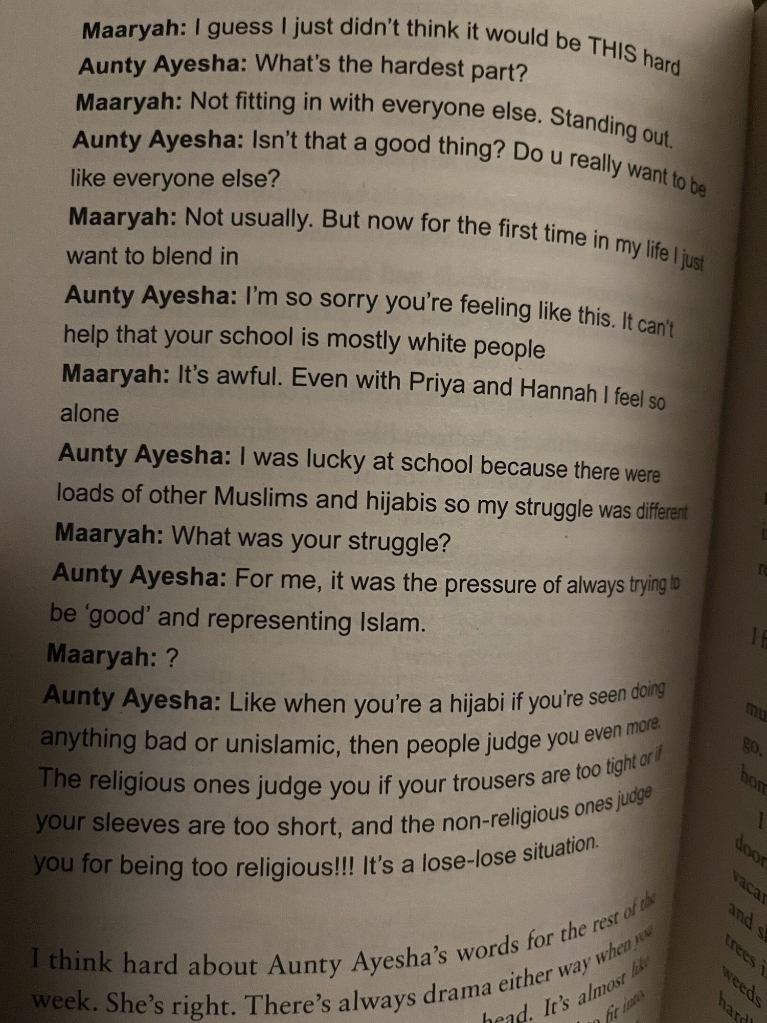 At 368 pages this identity centered mature YA book really hooked me and had me invested, which is impressive because Islamophobia stereotypes and being the new kid in a new place tropes are pretty frequently done, and often after a while, feel repetitive.  For me the charm of this book is actually not Maaryah and her peers/friends/bullies storylines, but the protagonist’s relationship with her parents and what caused her mom and dad to divorce.  Obviously as a mom of teens, I’m not in the target audience, but I feel like I benefited from the Muslim authored, Islam centered book, and think older teens, perhaps 17 and up, will also find the book enjoyable and reflective of views they have, challenges they face, and boundaries they have to establish.  I don’t want to spoil it, but SPOILER, had my dear friends that have read the book clued me in that the book will toe and slightly cross the haram lines, but ultimately show Maaryah deciding to re-establish her boundaries after being tempted not to, i.e. making a poor choice to attend a party with boys and alcohol present, and dressed in a way not typical to her hijabi style, I wouldn’t have read the last hundred and twenty pages or so with my jaw clenched in fear. The book shows a lot of Islam in practice, salat, duas, discussions about hijab, but not everyone will agree with decisions Maaryah makes or the rationale behind them as they vacillate between culture, religion, and family expectations.  I love that Maaryah is fallible and never abandons her faith, and that who we are is more than a singular mistake or instance of poor judgement. The book is not preachy, most will just take it as a girl finding her place in her new family dynamic in a new country, who happens to Muslim.  I think, an assumption really, based on what the author has said about her previous adult books, something along the lines that they are not meant to be Islamic fiction, but are stories with Muslim characters, and I think this book should probably be viewed the same.  There is swearing, hand holding, a side hug, normalized boy girl friendships, lying, running away, deceit, cheating, alcohol, mention of hookups, dating, vaping, music, flirting, hijab questioning, bullying, physical assault.  My biggest concern about the book is that it brings up Palestine, but doesn’t discuss Palestine. A side character is a non practicing Jew that visits Tel Aviv and Maaryah wants to discuss the occupation with her, but hesitates and the moment passes.  It is never revisited which I really wish it would have.  It could have modeled a bit how to have those conversations, I know it isn’t that type of book, but Maaryah mentions repurposing kaffiyehs in her designs and so it hints that it matters to her, but never pulls on that thread.  At one point it also mentions another character posted something pro Isr@*l during the genocide, which I can only assume the author thought that by the time of publication would have ended.  SubhanAllah ya Raab.