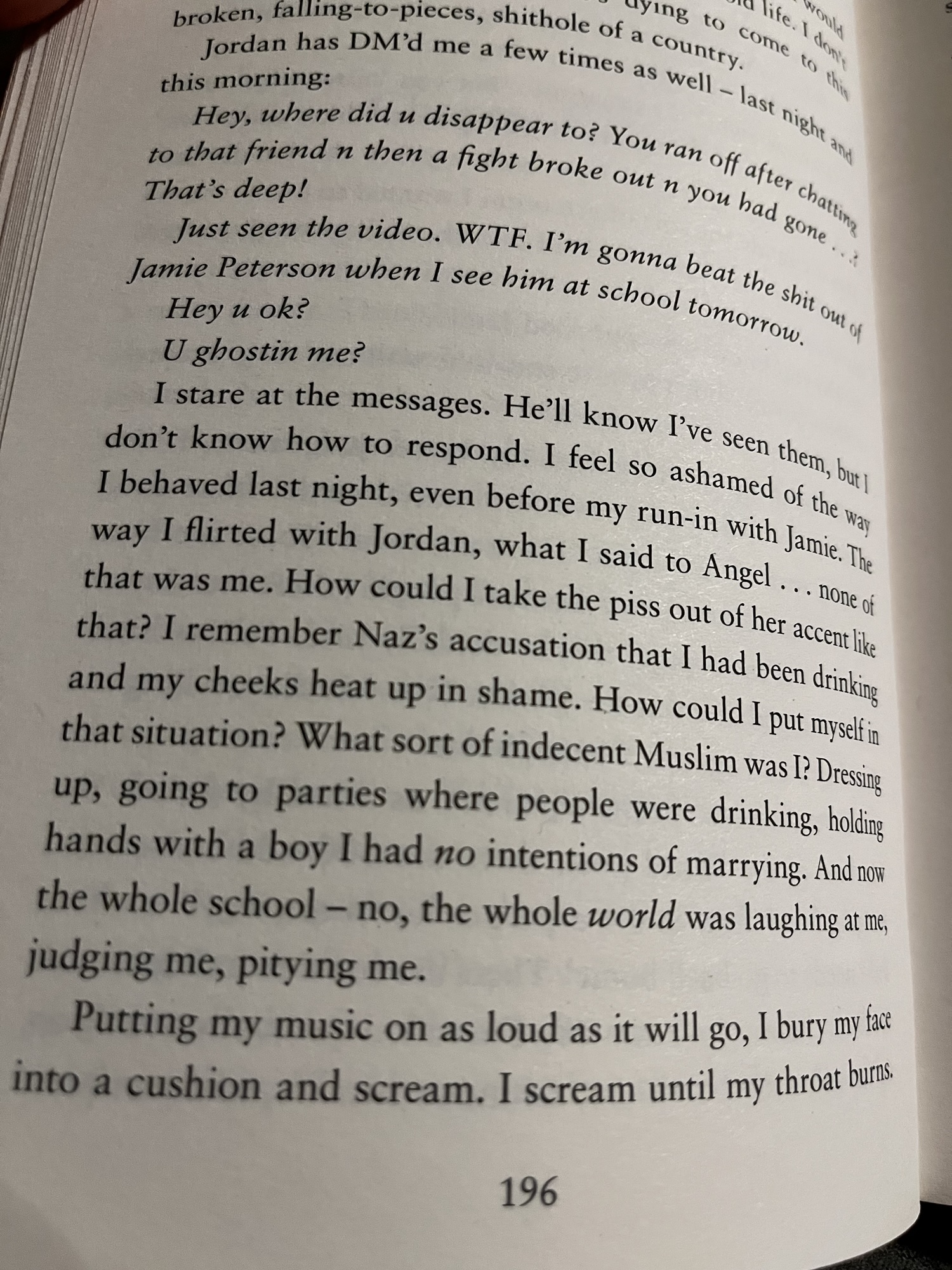 Islam is presented through the harshest of harsh characters, a few side characters are brought in that make Islam more realistic in practice and fleshed out, but it really feels like it is too little too late.  I think a non Muslim would feel Islam is just modest dress, no interacting with boys, marrying early, and rigid rules.  Leena is harassed from the first moment she meets her family, no easing in to it, she is even handed brochures on her first visit to her grandfather’s home.  Yet, Leena never shows any interest in learning about Islam, she could Google it if she was curious, even when at the masjid, she doesn’t go and watch them pray, no connection to Allah is ever discussed, it is just dos and do nots.  Consistently throughout it feels like Islam is weaponized and perhaps that is the author’s experience or intent, but it is odd coming from a Muslim writer in a fictional setting.  We get enough of that stereotyping from the non Muslim real world.