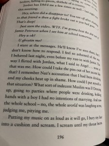 I read an ARC so I am aware that changes could have occurred, I’ve requested the book from my library and it is on order, and I will come back and correct this paragraph if needed.  The story of tae kwon do is repeated in two different spots almost word for word as if the information that Asiyah was good at tae kwon do both times is news to Leena.  Clearly it is in error.  It also has Deidre’s grandmother getting their house with the insurance money from Deidre’s parents dying and then a few lines later saying how the grandma doesn’t let Diedre forget that the spare room was changed to a bedroom for Diedre when she moved in.  A friend, Rheem, is brought in guide Leena academically, and is described as being homeschooled and changing to an online program for her senior year to also take dual enrollment classes, a few chapters later they are going to her Islamic High School for a party.  Side note, the sign on the high school says, “ALHIDAAYAH ISLAMIC SCHOOL: Grades sixth through twelfth.  We want our children learning it’s okay to be both American and Muslim.” The last page of the book also has a “Sharifa” in the back seat, and there is no Sharifa previously mentioned in the book.