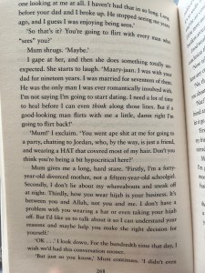 I read an ARC so I am aware that changes could have occurred, I’ve requested the book from my library and it is on order, and I will come back and correct this paragraph if needed. The story of tae kwon do is repeated in two different spots almost word for word as if the information that Asiyah was good at tae kwon do both times is news to Leena. Clearly it is in error. It also has Deidre’s grandmother getting their house with the insurance money from Deidre’s parents dying and then a few lines later saying how the grandma doesn’t let Diedre forget that the spare room was changed to a bedroom for Diedre when she moved in. A friend, Rheem, is brought in guide Leena academically, and is described as being homeschooled and changing to an online program for her senior year to also take dual enrollment classes, a few chapters later they are going to her Islamic High School for a party. Side note, the sign on the high school says, “ALHIDAAYAH ISLAMIC SCHOOL: Grades sixth through twelfth. We want our children learning it’s okay to be both American and Muslim.” The last page of the book also has a “Sharifa” in the back seat, and there is no Sharifa previously mentioned in the book.