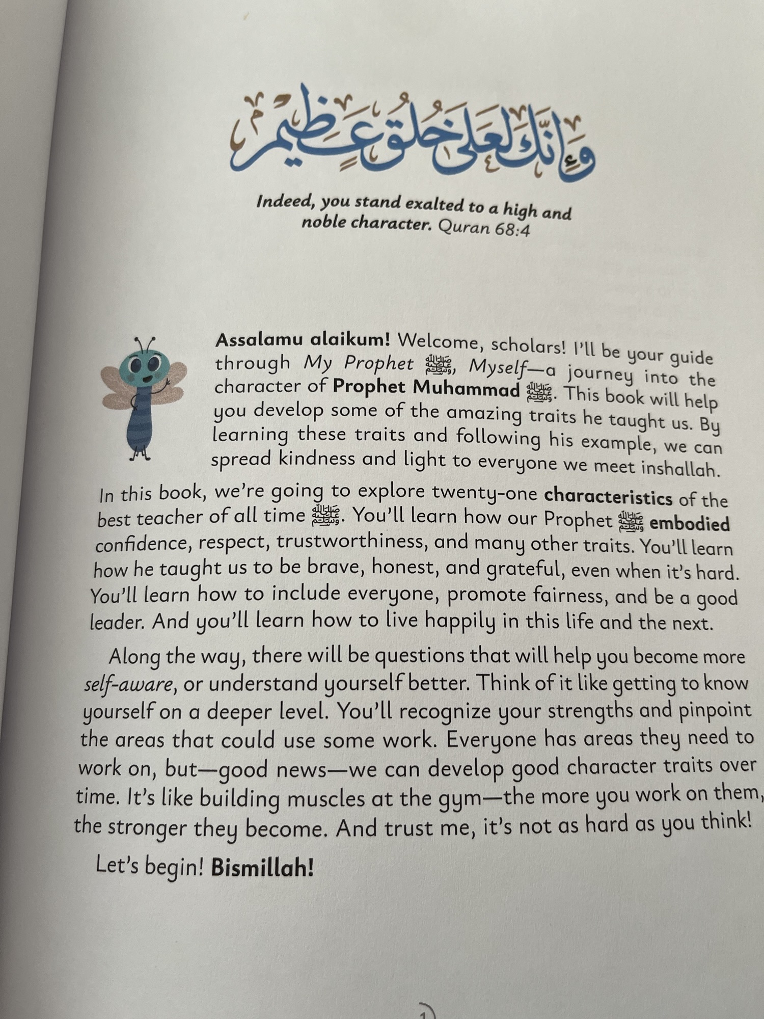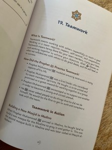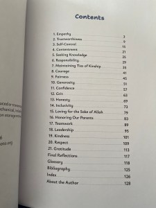 The book is 128 pages and the soft back binding is large 11 x 7, making it easy to hold and read if addressing an audience. There are a few illustrated pages to break up the text, and the little, presumably Rabata Firefly, buzzing around most pages. The 21 virtues are Empathy, Trustworthiness, Self-Control, Contentment, Seeking Knowledge, Responsibility, Maintaining Ties of Kinship, Courage, Fairness, Generosity, Confidence, Grit, Honesty, Inclusivity, Loving for the Sake of Allah, Honoring Our Parents, Teamwork, Leadership, Kindness, Respect, and Gratitude.