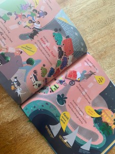 It is hard to say if the text adds to the illustrations or the illustrations to the story, both combine to make this book impossible to read without smiling. I love that the mosque is shown in the daytime and at night implying that the call to prayer is not a one time thing without articulating that Muslims pray five times a day. I don’t know if the author identifies as Muslim or if the inclusion of the athan and Allah u Akbar is just an environmental reality of Egyptian daily life and thus featured. The illustrator could have very well added the hijabs on his own as there is nothing religious or explanatory in the text. Perhaps it is worth noting that there is a dog in the family’s home that seems to sleep with the little girl. The book is a cultural heartfelt portrayal, and that Islam is prominently featured so beautifully made for a lovely surprise.