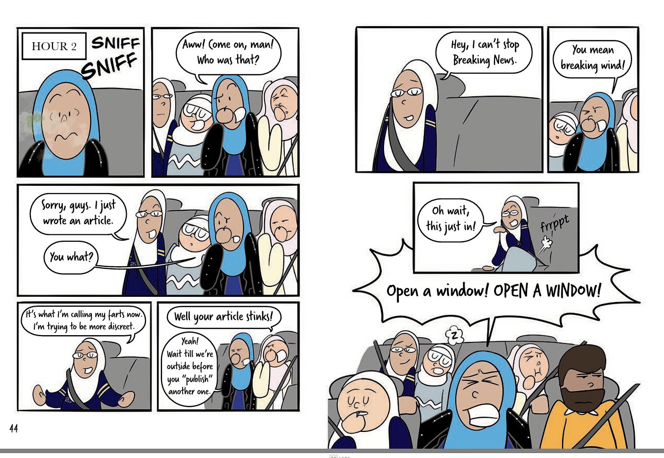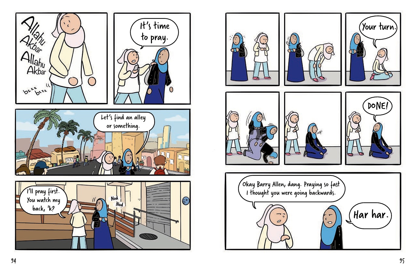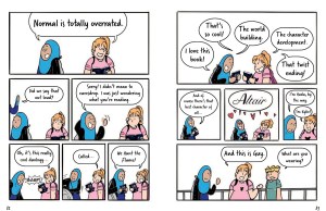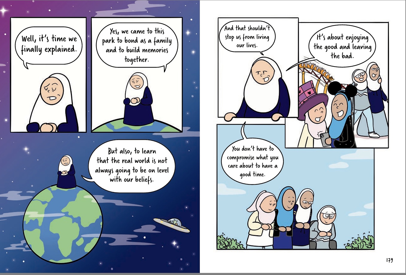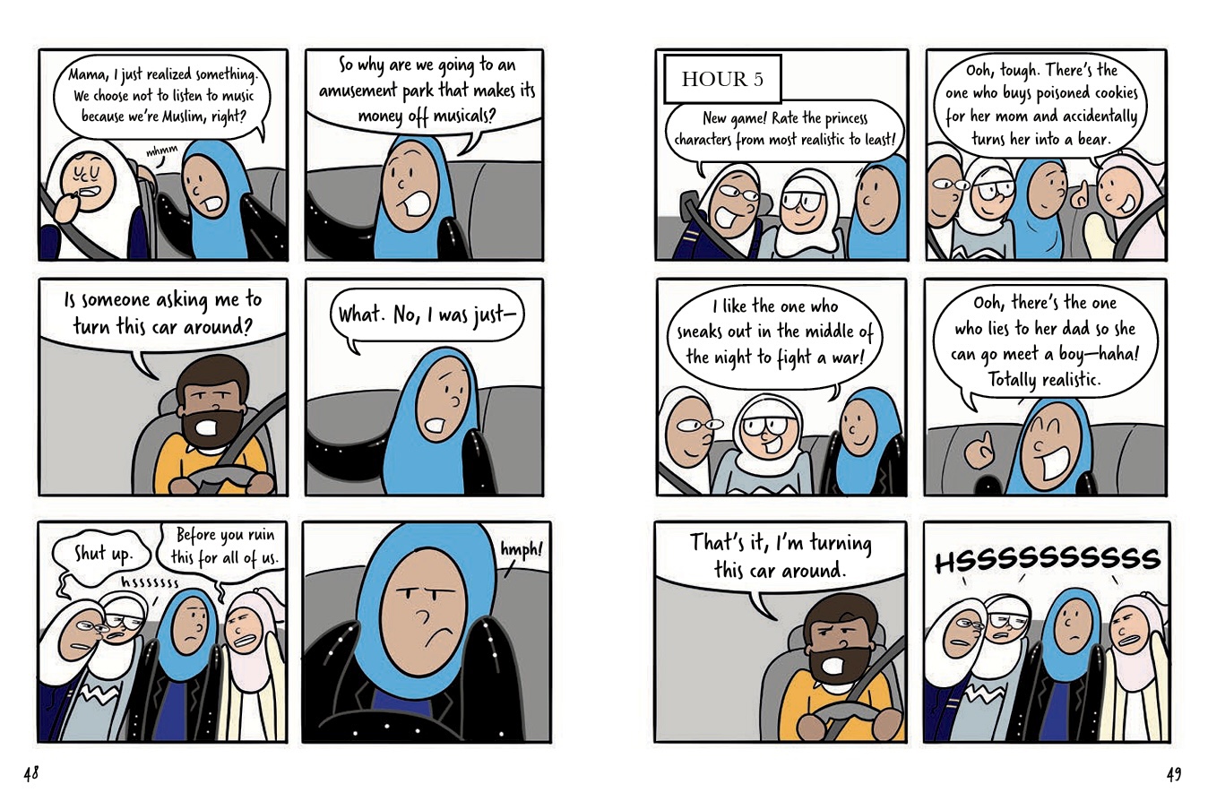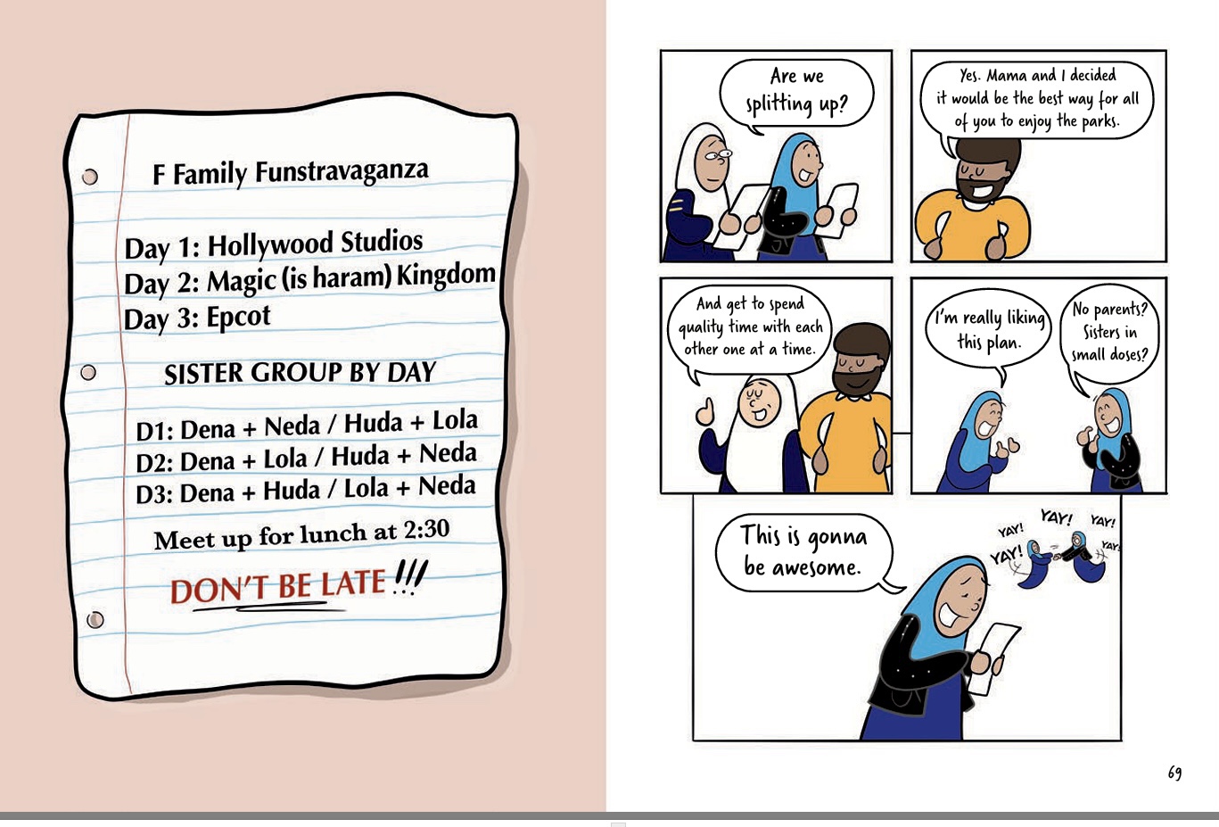 There is nothing quite like reading a YA graphic novel where you feel so completely seen, where you laugh out loud and snort at the shared idiosyncrasies, and where you don’t have to worry that the next page will normalize something haram.  This book, and the entire series, are such a gift to us all that I’m posting this review now, knowing full well that the book does not release until October, with the hopes that you will all preorder it.  This OWN voice authentic rep needs all the support we can offer it to signal to publishers that we want to see books like this published for our kids, ourselves, to share with our Muslim and non Muslim friends and that we want to see similar unapologetic voices in the future.  Huda loves Islam, she is Muslim, but that doesn’t mean she doesn’t feel uneasy at the idea of praying in public, or making wudu at a rest stop.  Her sisters sing Native Deen’s M-U-S-L-I-M to call her out, she fan girls about We Hunt the Flame, and the entire book reads like time spent with friends who can keep you laughing, comfort you when needed, and who are willing to share their very real relatable world with you as they take on Disney World.